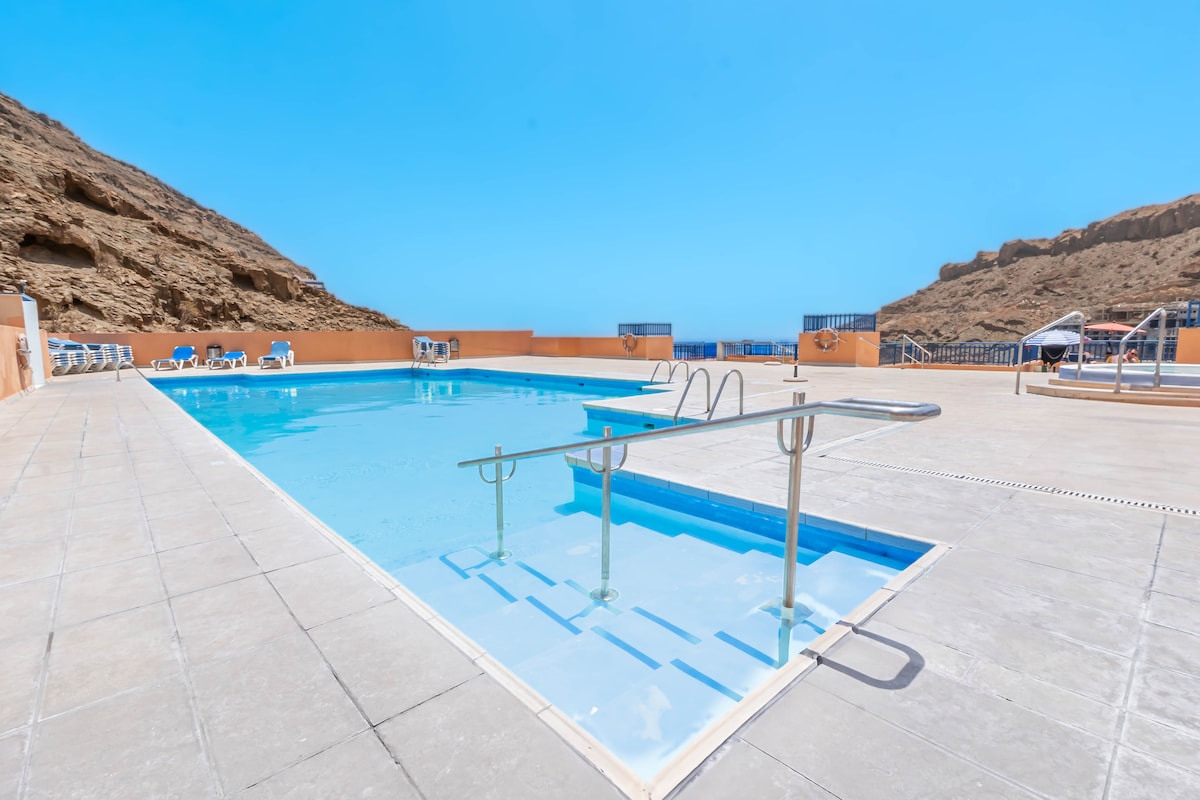 Fantastic apartment with panoramic sea views. The apartment was fully renovated in 2024 using quality materials. It is located in the Los Canarios complex in Patalavaca, featuring a large saltwater swimming pool, on the front line with spectacular views of Anfi del Mar and the Atlantic Ocean. The apartment consists of a fully equipped kitchen and living area, one double bedroom, and a modern bathroom. The property has a charming patio at the entrance and a great balcony with fantastic sea views.