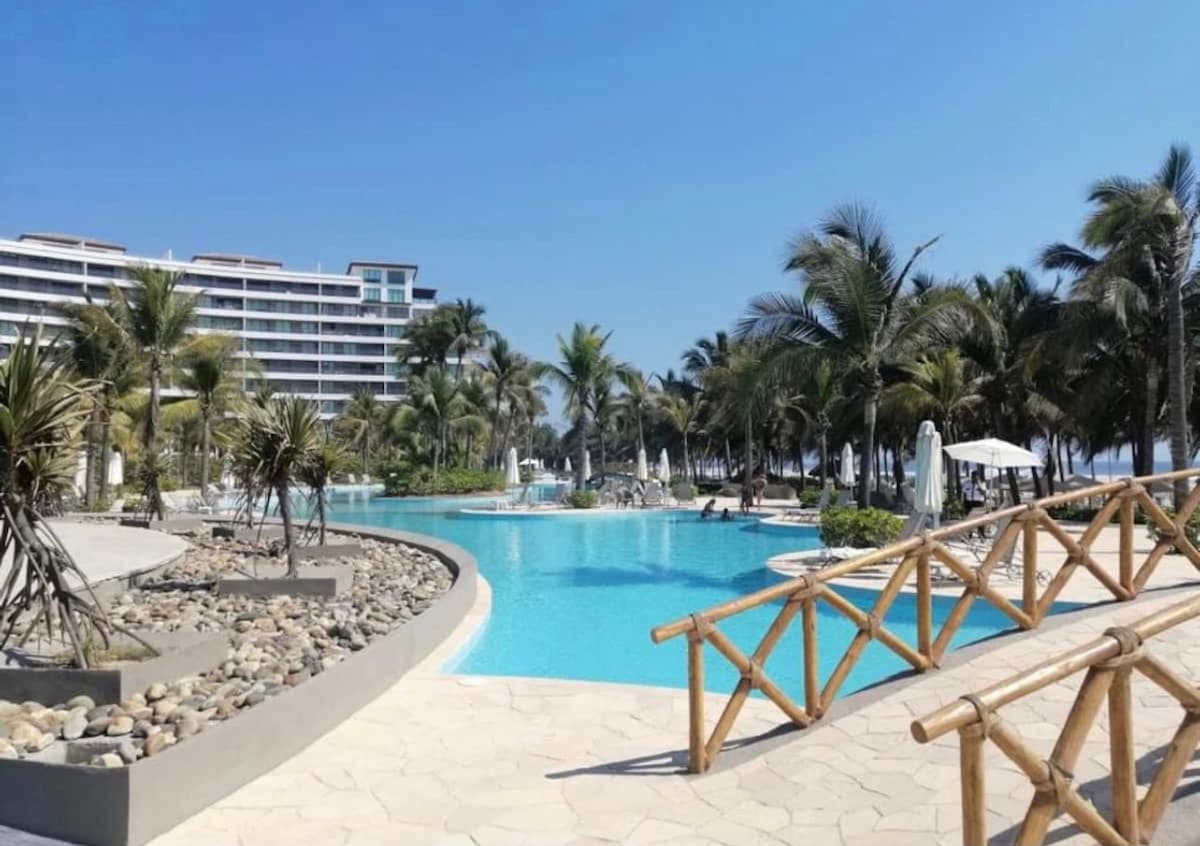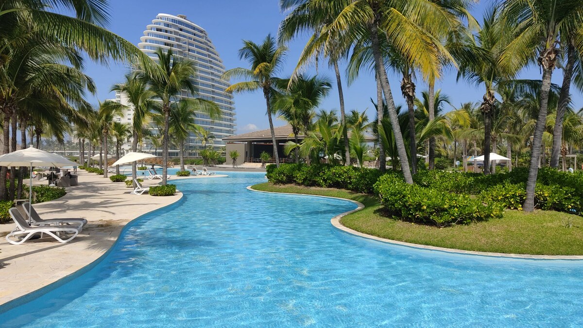 Beautiful apartment for 8 people in Acapulco Diamante. Fully furnished and equipped. With a private terrace; 2 parking spaces; Pools with umbrellas and lounge chairs; Direct access to Beach Club; Paddle, volleyball, soccer, and basketball courts; Equipped gym. Solidly built and 100% safe apartment (no hurricane damage). Steps away from the 7.17 event hall and minutes from La Isla shopping center, restaurants, and bars. The complex has 24/7 private security.