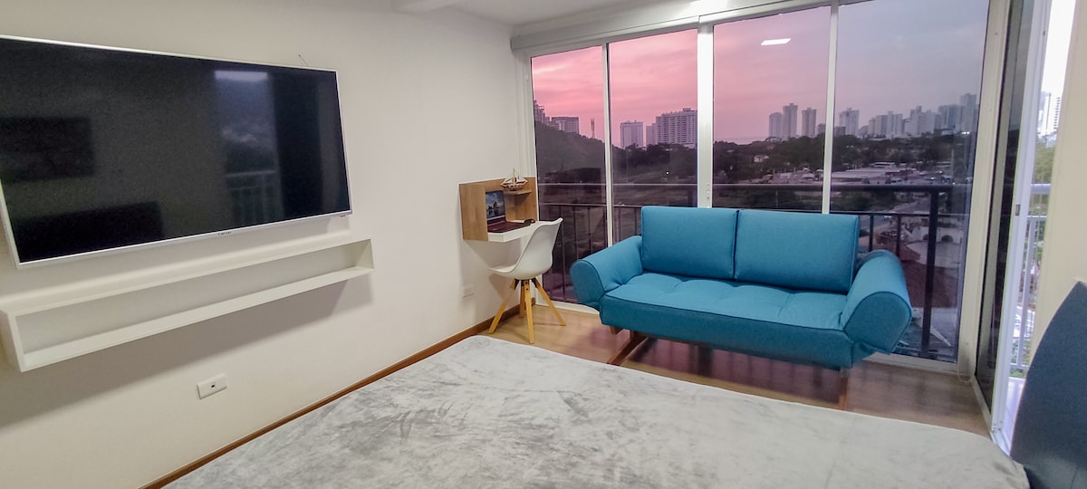 Frábær íbúð á 9. hæð með sjávarútsýni, tilvalin fyrir 1, 2, 3 eða jafnvel 4 gesti. Hér eru 2 svefnherbergi, stofa, vel búið eldhús og en-suite baðherbergi. Það býður upp á þjónustu á borð við Claro TV, sérstakt þráðlaust net og þráðlaust net í byggingunni, almennt orkuver, eftirlitsmyndavélar á sameiginlegum svæðum, bílastæði og einkaþjónustu allan sólarhringinn. MIKILVÆGT: Samkvæmt fyrirmælum stjórnvalda við skráningu í móttökunni þarf að greiða $ 14.000 fyrir stjórn- og öryggisarmbönd fyrir gesti.