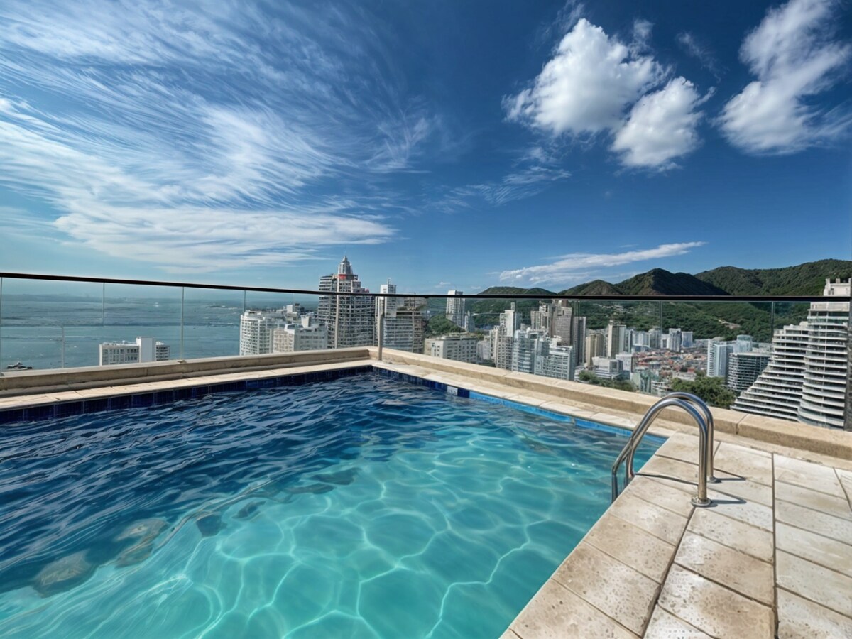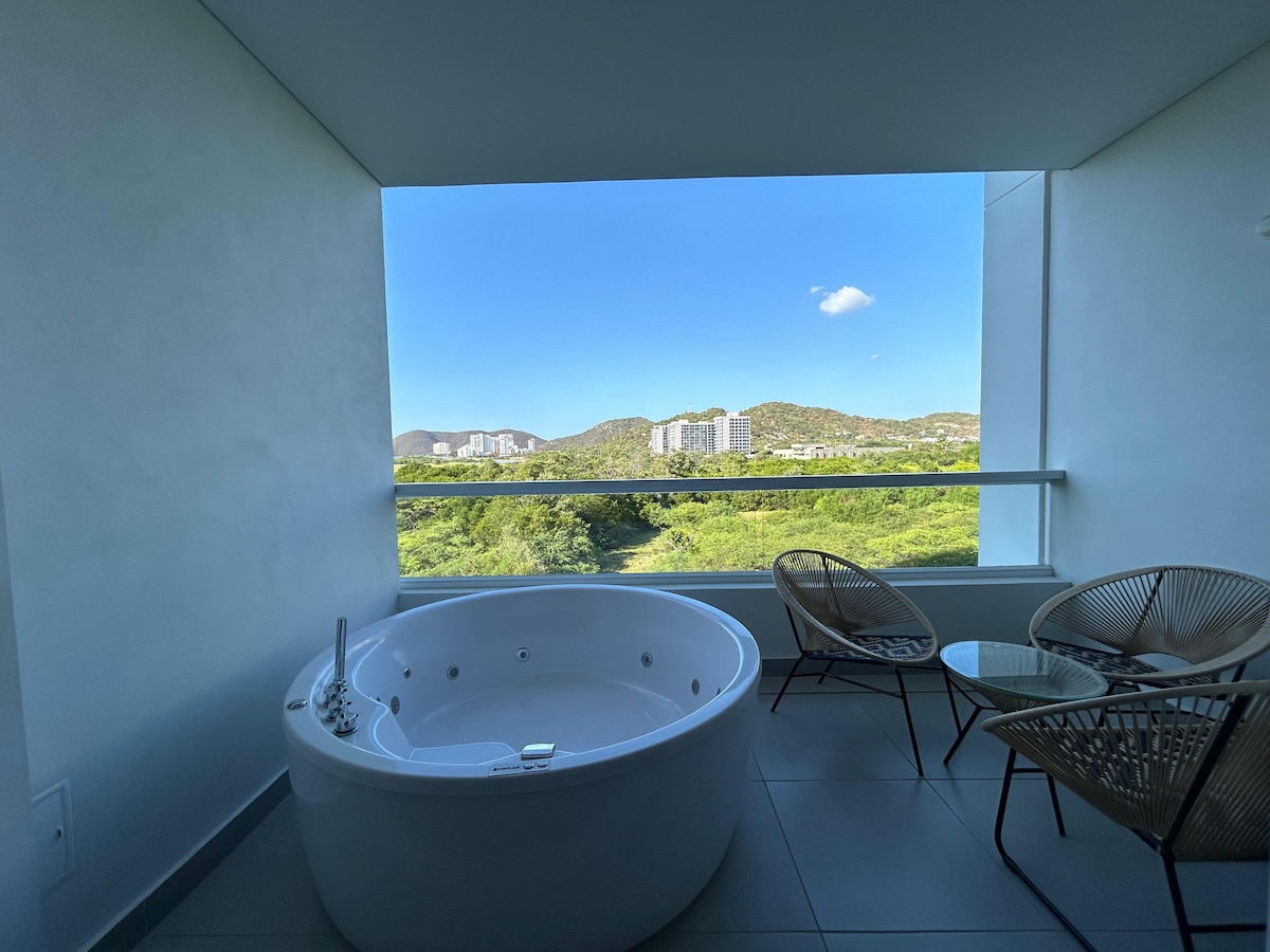 Comodo apartasuite con vista al mar, Edf. con: jacuzzi. piscina en terraza. sauna. turco. dispondrás de cocina completa y equipada. aire acondicionado. ventilador de techo. 2 Smart tv. reproductor de sonido. 2 camas dobles con colchones resortados, 1 amplio sofacama de más de 1.90 Mt de largo. ubicación estratégica, será muy fácil planear tu visita, en rango de 1 a 3 cuadras. cuentas con más de 4 supermercados droguerías. restaurantes. el mar. acuario. un centro comercial. agencias de turismo.