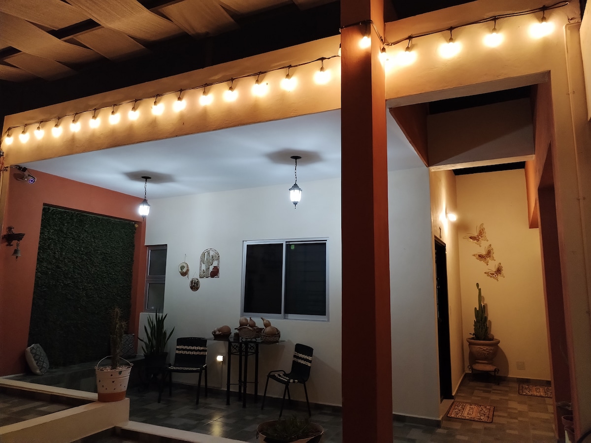 Relájate con toda la familia en este alojamiento donde la tranquilidad se respira. Somos pet friendly. amplio patio con asador y mesa de jardín. En uno de los sectores más seguros de Los Mochis, a sólo media cuadra de un parque recreativo, para que lleves a tus hijos o mascota a pasear, cochera para dos autos con portón eléctrico totalmente refrigerada, cerca de centros comerciales, tiendas de servicios y universidades.