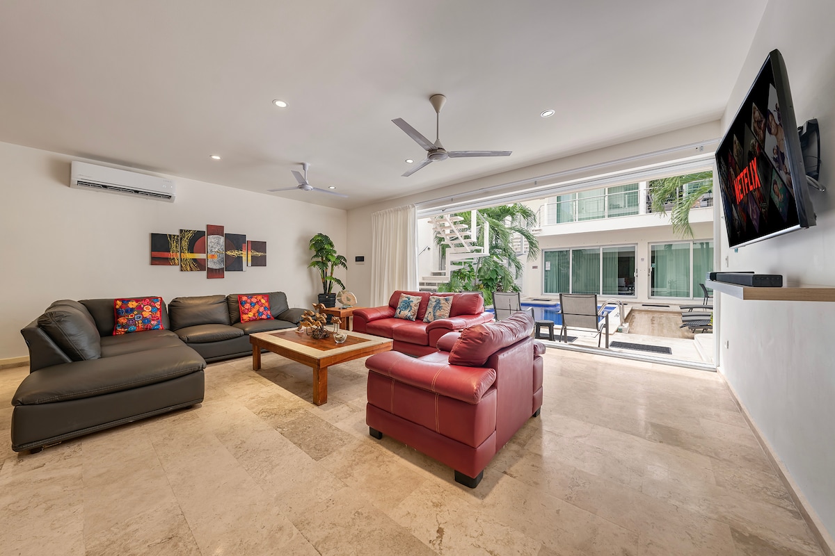 Upplifðu alsælu við íbúðina okkar við sjávarsíðuna Isla Mujeres! Útsýnið yfir endalausa hafið og kveikir á skilningarvitunum. Uppgjöf til friðsældar þegar þú hallar þig við sundlaugina og tekur á móti ljúffengum kossi sjávargolunnar. Ókeypis strandklúbburinn okkar býður þér að láta eftir þér strandrúm en stafrænn leiðsögumaður okkar tryggir snurðulaus ferðalög. Leyfðu heillandi Isla að fanga þig og mynda dýrmæt augnablik í þessu himneska afdrepi. Ferð þín til friðsældar!
