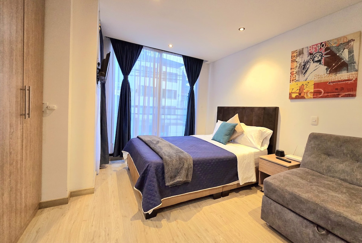 Þægileg eins svefnherbergis sundur-stúdíó okkar, innri staðsetning með gluggum í átt að bílskúr og að garði, bóhem, lægstur, með litlum garði hefur sanna borgartilfinningu! Það rúmar þægilega fjóra einstaklinga og þaðer staðsett miðsvæðis á götu, með greiðan aðgang að Simon Bolivar Metropolitan Park. Njóttu fullbúins eldhúss og aðgangs að Transmilenio. Þessi eign er tilvalin fyrir tvær manneskjur en við bjóðum upp á hágæða svefnsófa fyrir tvo í viðbót ef þörf krefur.