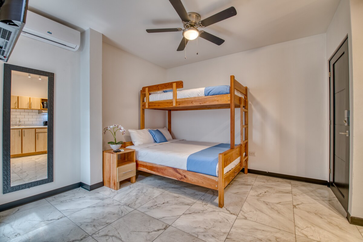 Located in San Jose Downtown. A large queen/twin bunk bed sleeps 3 guests comfortably along with a private bathroom with hot water shower. The apartment features Air Conditioning, a private Kitchen with a mini-fridge, microwave, and sink, LCD TV with cable, and fast WIFI Internet. There is a work area with a desk and two stools. The Outdoor Patio features natural light and a sitting area. The apartment is on the Second Floor Building, reception area has a night Security Guard.