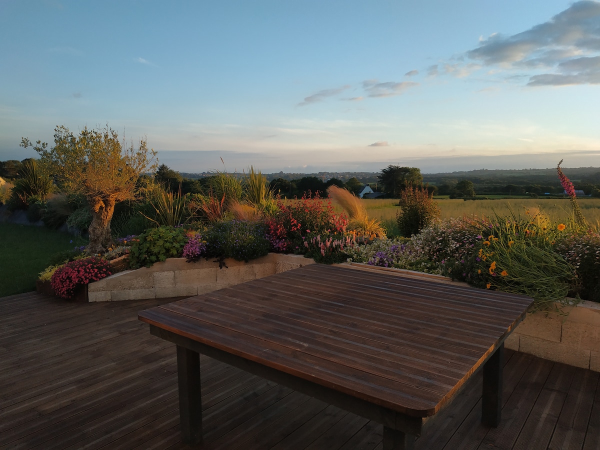Verið velkomin í Ty Kerizivin, stórt sveitahús, nálægt býli, sem er hannað til að taka á móti allt að 10 manns í algjörri kyrrð, í aðeins 5 mínútna akstursfjarlægð frá ströndunum og nálægt Brest. Þetta er fullkomið fyrir fjölskyldur, vinahópa eða fjarvinnu sem sameinar rými, þægindi og náttúru. 👨👩👧👧 Allt að 10 gestir 🛏️ 5 svefnherbergi – 5 rúm 🛁 2 baðherbergi, 📐 130 m² 🌳 Stór garður með verönd 📍 Plouzané
