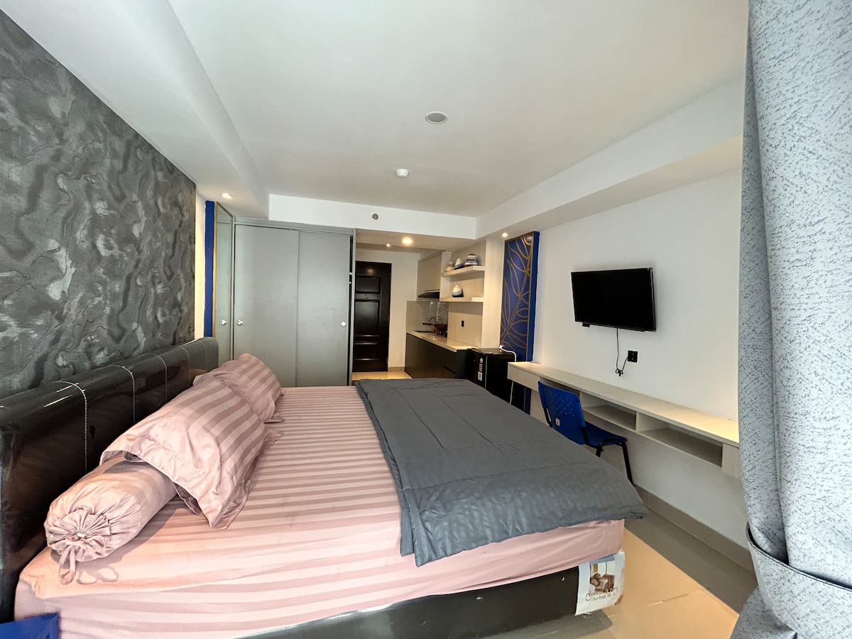 Halló, ég heiti ChickyPouch og er gestgjafi þinn í hjarta Medan! Þetta er ekki bara gisting heldur notalegt og snjallhúðað afdrep með tveimur svefnherbergjum í Lexington Tower, Podomoro. Njóttu Netflix-kvölda, morgunkaffis á svölunum og beins aðgengis að Delipark-verslunarmiðstöðinni. Hvort sem þú ert hér til að vinna eða slaka á, þá hefur þú sundlaug, ræktarstöð, fullbúið eldhús og þvottahús innan seilingar. Öruggt, þægilegt og fullt af góðum stemningu. Ég hef útbúið þetta allt fyrir þig. 🐣💛