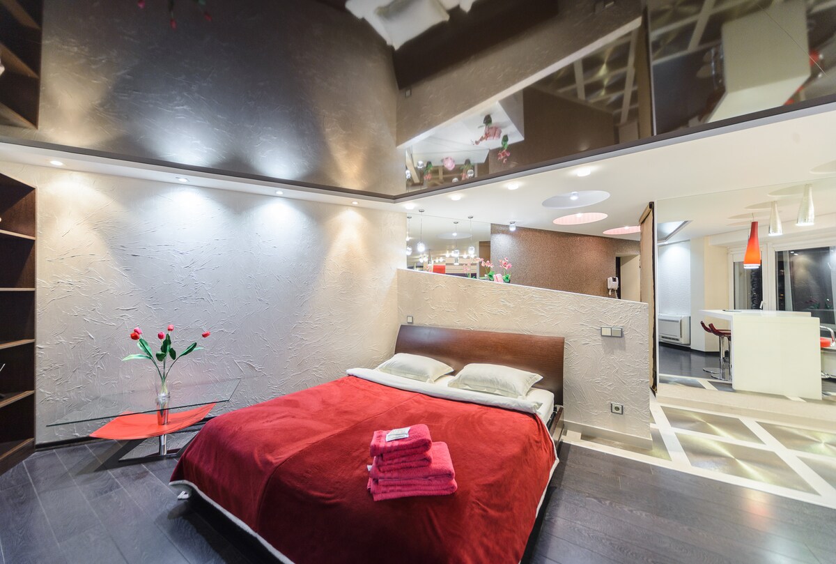 Mikilvægt: Frá og með þessum degi verður ekki lengur gert ráð fyrir rafmagnsleysi í eigninni. Flott, nútímaleg hönnunaríbúð í miðborg Kyiv sem hægt er að ganga um. Hún er staðsett við sögulega Desyatynna-götuna - rólega gönguleið sem tengir Andriyivsky-niðurskröpunina og Mykhaylivska-torgið. Þetta er besta staðsetningin fyrir dvöl þína í Kænugarði, nálægt Intercontinental og Hyatt-hótelunum ásamt einstökum veitingastöðum og börum, almenningsgörðum borgarinnar og sögufrægum stöðum.