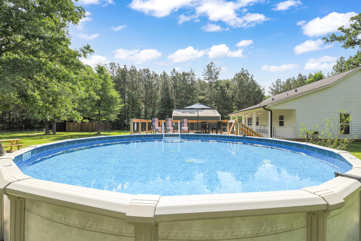 Escape to Whispering Pines Hideaway, a cozy 3-bedroom, 2-bath retreat located on 15 wooded acres just minutes from Lake Livingston. Hvort sem þú ert að skipuleggja fjölskylduferð, rómantískt frí eða vinahelgi býður þetta heimili upp á fullkomið jafnvægi milli afslöppunar og skemmtunar. Vaknaðu með kaffi á ruggustólum á veröndinni, eyddu deginum í að synda í einkasundlauginni eða slappaðu af í heita pottinum utandyra undir stjörnubjörtum himni. Í bakgarðinum er einnig eldstæði, hesthúsagryfja og rúmgóður pallur.