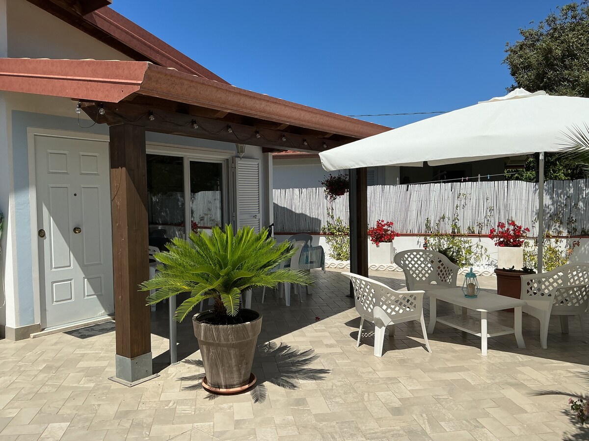 Íbúð sem er 60 fermetrar að stærð og samanstendur af stofu með tvöföldum svefnsófa, eldhúsi, baðherbergi með sturtu, svefnherbergi, svefnherbergi með hjónarúmi. Útiverönd og lítill garður frátekinn , fataslá. Frátekið bílastæði inni í húsagarði íbúðarinnar, inngangur að íbúð. Það er í 500 metra fjarlægð frá sjónum, sveitamegin við S.S.148. Húsnæðið útvegar rúmfötin sé þess óskað en gestir sjá um handklæðin.