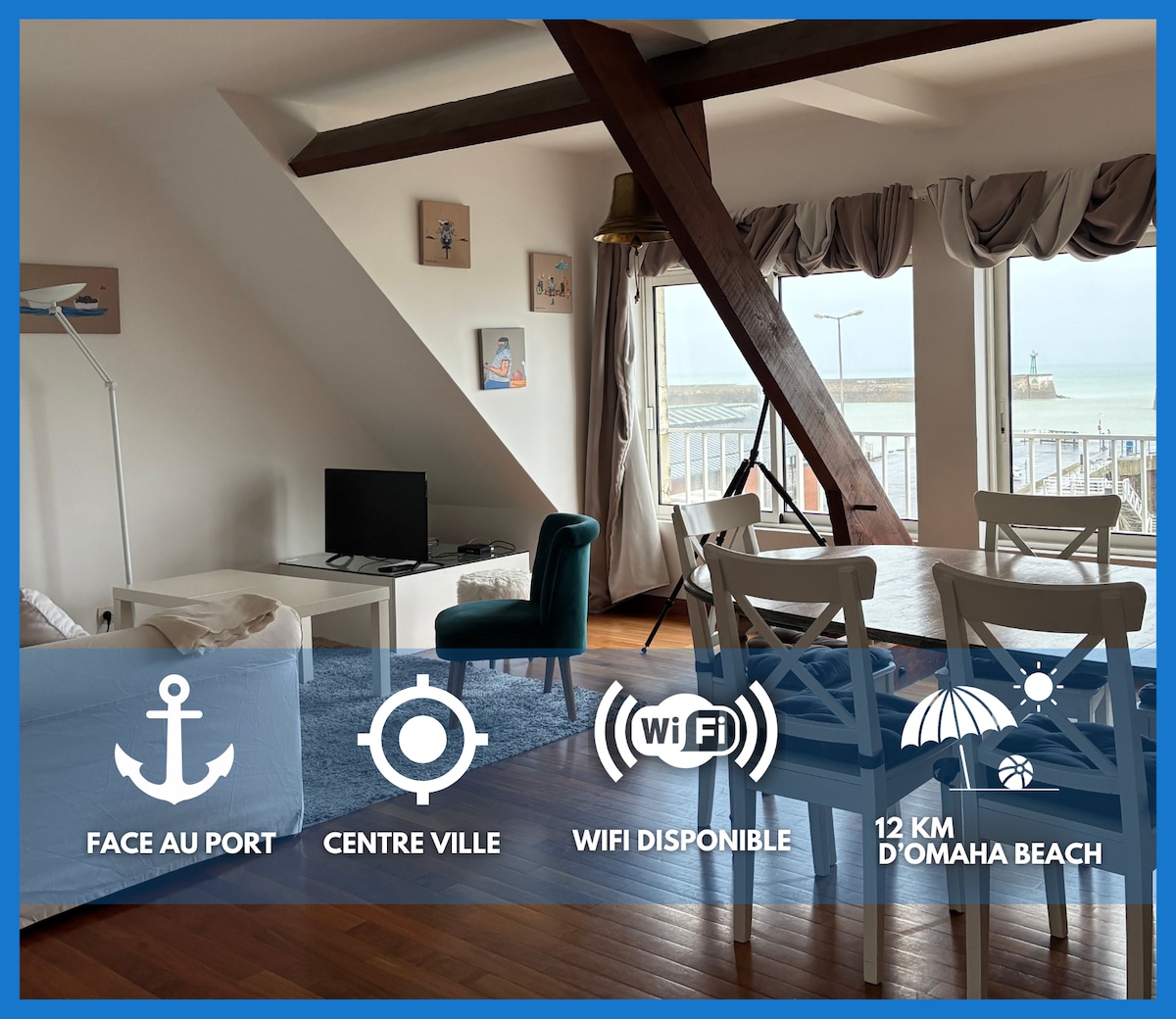 íbúðin er í miðju þorpinu Port en Bessin, við rætur hafnarinnar, veitingastaða og verslana. Þú verður í hjarta lendingarstranda 9 km frá Bayeux. Íbúðin er 26 m2 með fullbúnu eldhúsi, svefnherbergi og baðherbergi Það er staðsett á annarri og efstu hæð, án lyftu, í lítilli gamalli byggingu. Gestir geta lagt bílnum fyrir framan bygginguna, við höfnina eða á bílastæði í 50 metra fjarlægð. Öll bílastæði eru ókeypis. Þráðlaust net í boði.