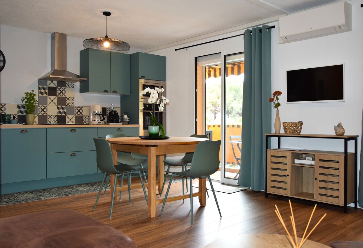 Helst staðsett, allt á fæti, strönd, höfn og verslunum í næsta nágrenni. Íbúð á 1. hæð í skóglendi í rólegu suðurátt (þvottavél, loftkæling, ofn, sjónvarp, þráðlaust net, Tassimo kaffivél, plancha...). Gistingin samanstendur af aðalherbergi með amerísku eldhúsi, öllu útsýni yfir svalir sem eru 10m2. „Lokað svefnaðstaða með 2 tvíbreiðum rúmum, stofan er með 2 sæta breytanlegum sófa. Baðherbergi. Öruggt húsnæði með bílastæði.