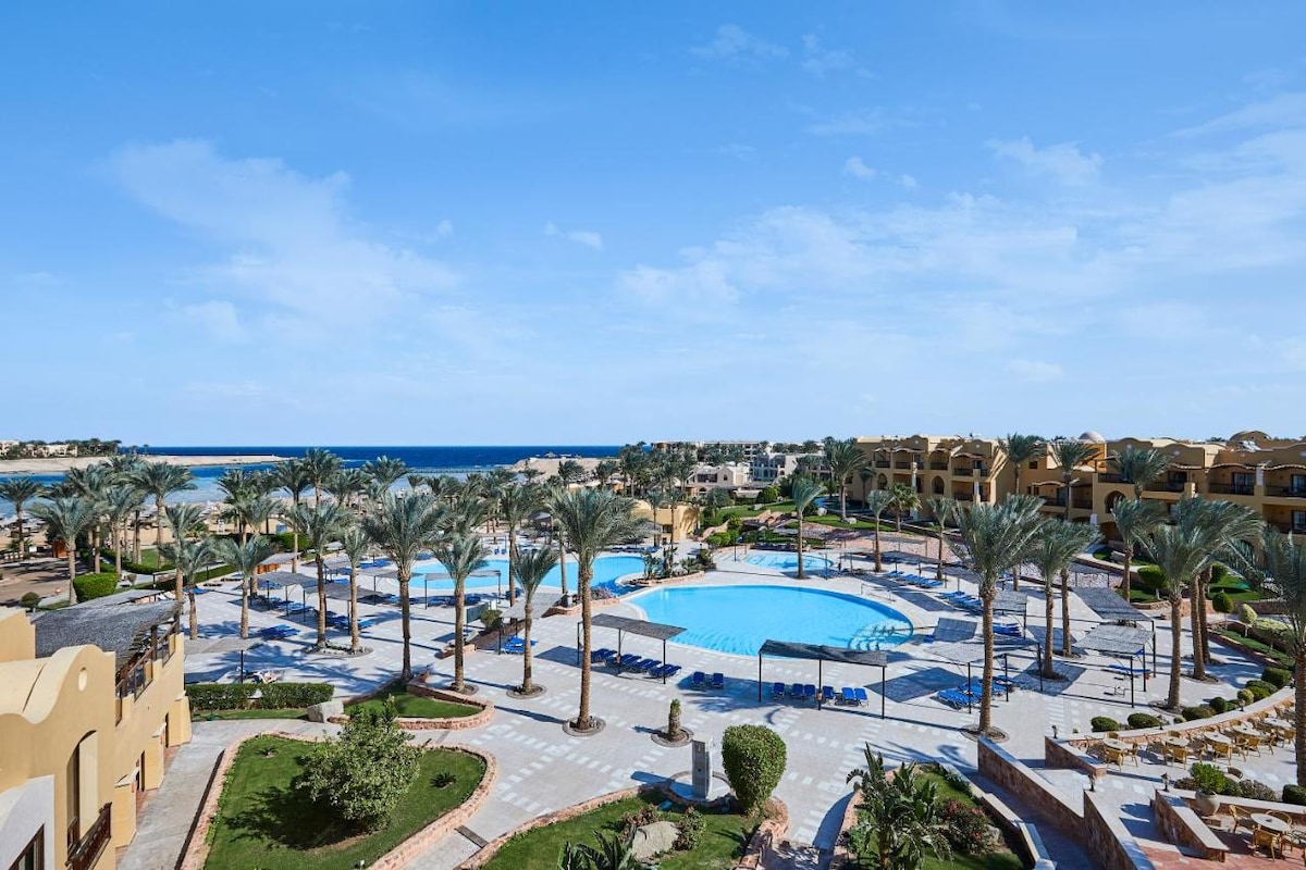 Beachfront retreat with seven pools, kids’ club, spa, gym, and multiple dining options. Rooms feature minibars, terraces, and modern comforts. Guests enjoy snorkeling, diving, and evening entertainment. Nearby attractions include Turtle Bay Beach, Marsa Shuna Beach, and Port Ghalib Marina.