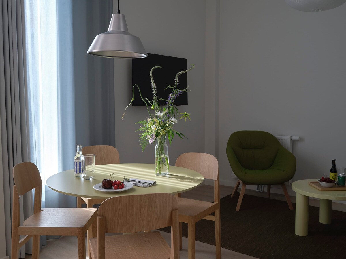 Gistu í sömu blokk og danska konungsfjölskyldan með Amalienborgarkastala neðar í götunni. Tvö aðskilin svefnherbergi með king-size rúmum og rúmgóðri sameign gera þetta að tilvöldum valkosti fyrir vini eða fjölskyldur sem ferðast saman. Þessar íbúðir eru staðsettar í hljóðlátum húsagarði. Þetta er nýlega innréttað með hönnunarinnréttingum og með risastóru baðherbergi og fullbúnu eldhúsi. Þessi skráning er með leyfi fyrir skammtímaútleigu sem styður við sjálfbæra ferðaþjónustu í Kaupmannahöfn.