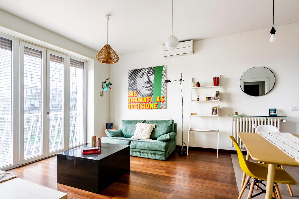 Njóttu frí pars í algjörum þægindum í þessari glæsilegu svítu í Mílanó-stíl sem er sökkt í Porta Nuova-garðinn með útsýni yfir lóðréttan skóg öðrum megin og Unicredit-turninn hinum megin. The Suite is bright and consists of living room with TV area, island kitchen with induction eldavél, double bedroom and bathroom. Til að gistingin verði ánægjulegri er loftkæling, ofn og þvottavél/þurrkari í íbúðinni. Hlökkum til að sjá þig!