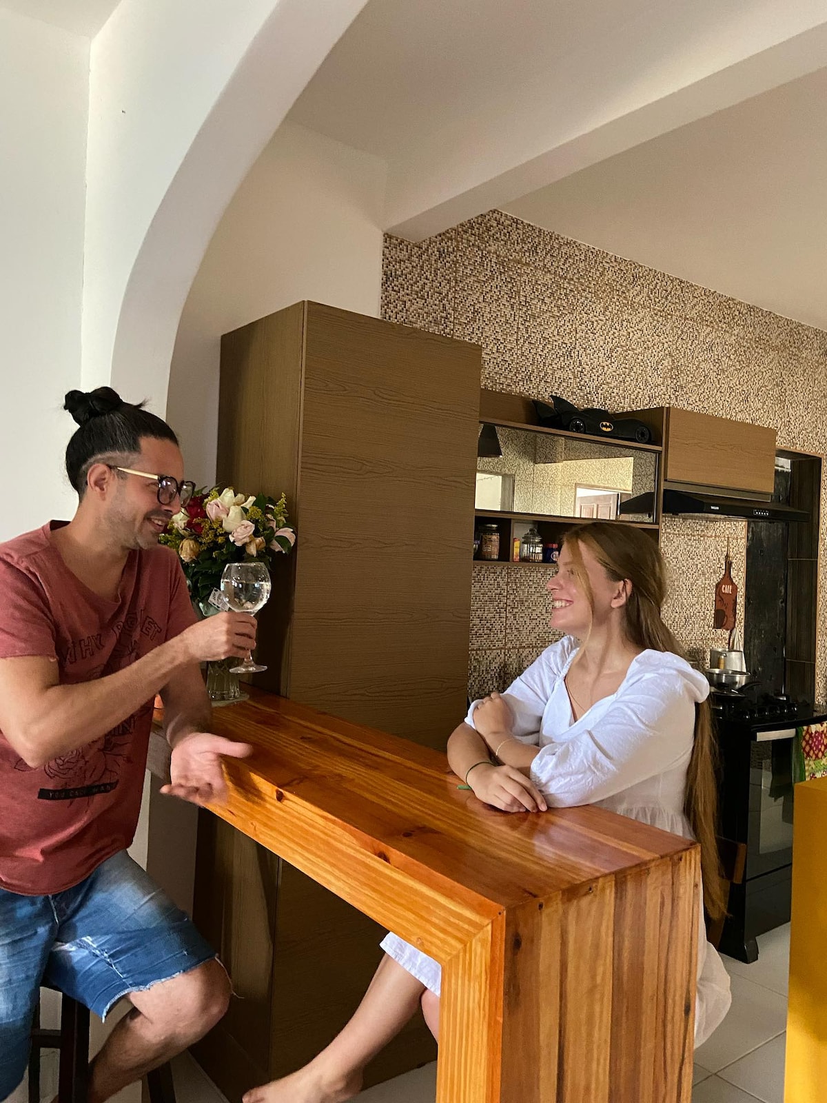 Hönnunarupplifunin Kynnstu þessu litríka, listræna fríi með útsýni yfir Todos os Santos-flóa. Njóttu sérstaks aðgangs að þriðju hæðinni með notalegu svefnherbergi, glæsilegri stofu og litlum eldhúskrók undir berum himni. Slakaðu á á þakinu með baðkeri og sturtu undir berum himni um leið og þú nýtur magnaðs sólseturs. Þú deilir restinni af húsinu með fjölskyldu minni, tveimur vingjarnlegum hundum og tveimur köttum. Við bjóðum upp á yndislegan morgunverð í aðaleldhúsinu.