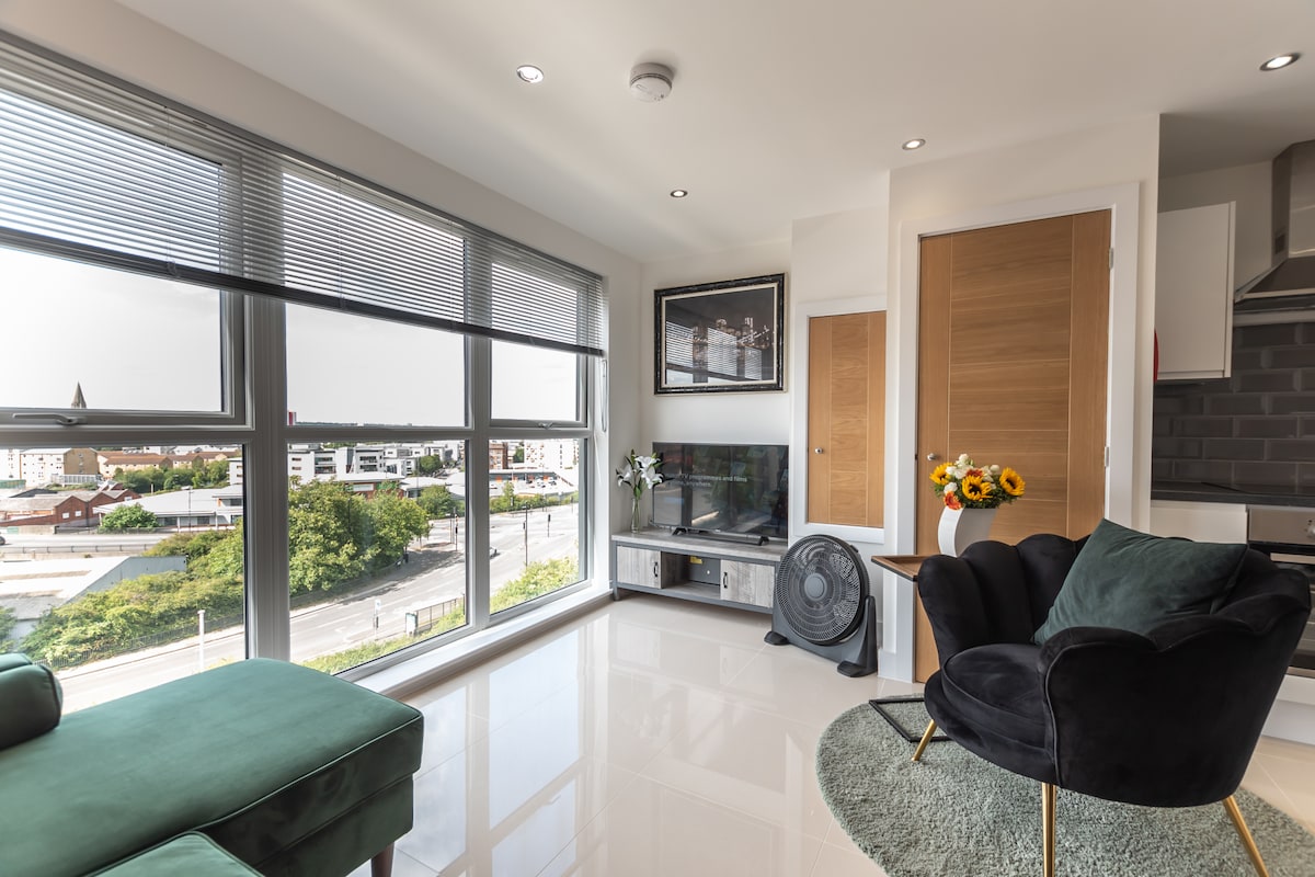 Sjálfsinnritun allan sólarhringinn, engin VIÐBÓTARÞRIFAGJÖLD, snjallsjónvörp, fullbúið breiðband. Stór íbúð, bílastæði í boði. Fullbúið eldhús. Gakktu að miðborginni, lestarstöðinni, dómstólum, háskólum, Royal South Hants Hospital og West Quay verslunarmiðstöðinni. Nútímaleg, létt og fersk lúxusíbúð í innan við 100 metra fjarlægð frá Tesco Express og Starbucks-kaffi. Tilvalið fyrir pör, sóló, viðskiptamenn og lögfræðinga. Þægilega rúmar allt að FIMM fullorðna. Fjölskyldur og börn velkomin.