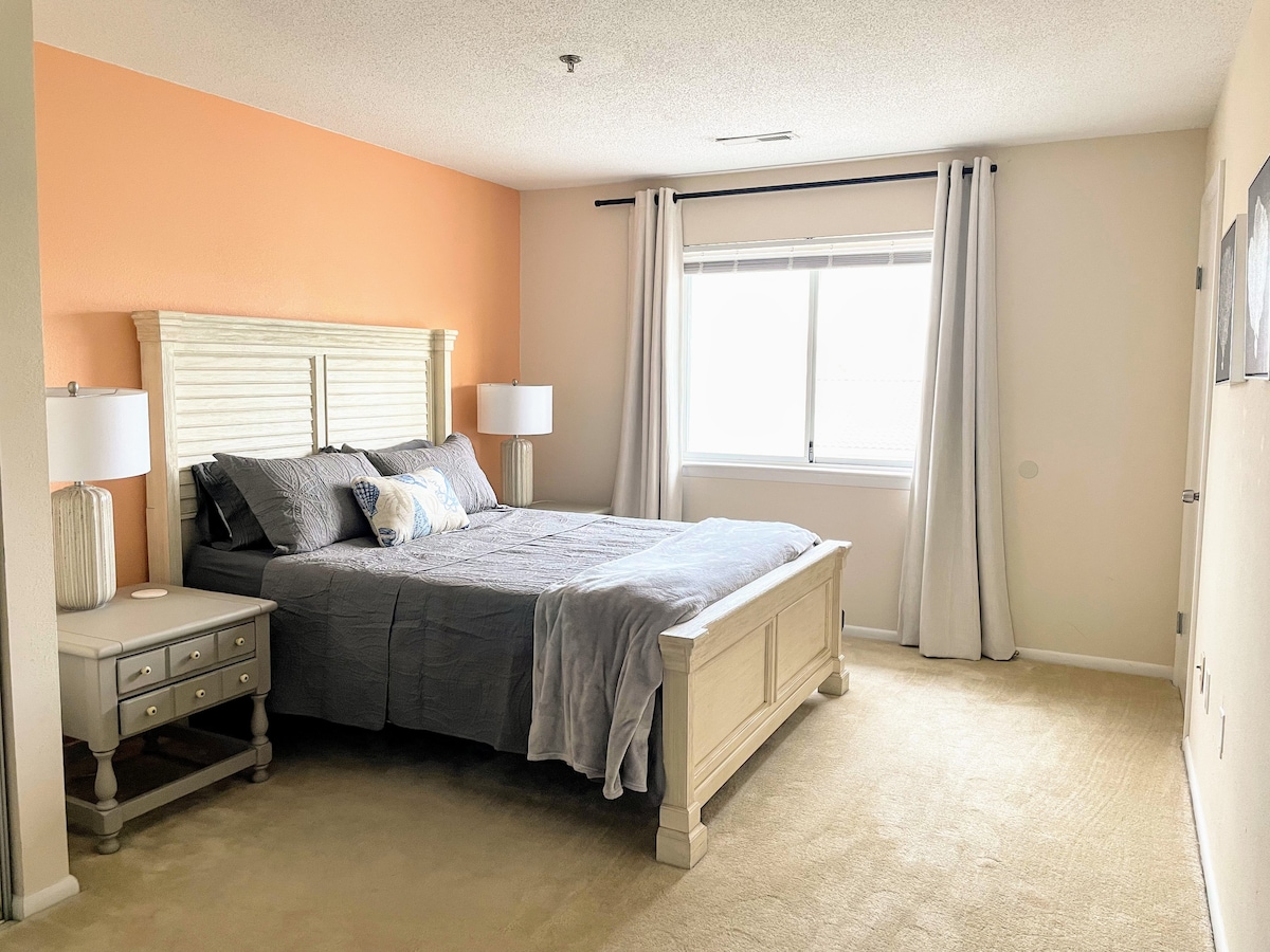 Njóttu alls þess sem Virginia Beach hefur upp á að bjóða. Íbúðin okkar er með alla þægindin sem eignin býður upp á og hún er fullkomin fyrir fjölskyldur. Svefnherbergið er með king-size rúm og stofan er með sófa sem dregur sig út í svefnsófa í fullri stærð. Sjónvörp í báðum herbergjum. Göngubryggjan, verslanir, veitingastaðir, skemmtigarðar og margt fleira eru í göngufæri. Það er nóg að gera og þú getur gengið á ströndina á 3 mínútum eða minna! Komdu og njóttu afslappandi og skemmtilegs frís við ströndina.