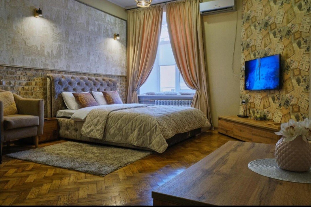 Lanzheron · Welcome to a charming studio located in a 19th-century architectural landmark. This unique space blends vintage elegance with modern comfort: original stucco ceilings, antique furniture, a fireplace, and classic window frames. Enjoy your morning coffee in the quiet green courtyard with a private entrance right from your apartment. 📍 Prime location: 5–7 minutes’ walk to the beach 20-minute walk to Odesa’s historic city center 💰 Special rates available for stays of 3 nights or more.