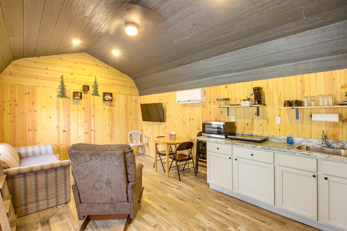 Slakaðu á í þessum kofa fyrir fullorðna sem rúmar 4 manns vel! Einkatiki-bar með grill með útsýni yfir vatnið okkar sem er fullt af abborum, bláum gilum og steinbítum! Fullkomið fyrir fiskveiðar og kajakferðir! Við erum með eldstæði, grillaðstöðu, göngustíg á staðnum, sæti utandyra, asna og smáhesta á staðnum. Í húsinu er nóg af því sem þú þarft til að elda/grilla! Nálægt hraðbraut, orlofsvatn, Williamsburg!