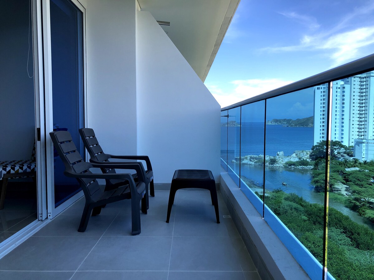 Glæsileg íbúð á 6. hæð með sjávarútsýni. Hann er 73 fermetrar að stærð og er innréttaður í nútímalegum og hlýlegum stíl. Staðsett fyrir framan alþjóðlegu smábátahöfnina og í 3 mínútna göngufjarlægð frá Parque de los Novios. Með 2 svalum til að njóta ótrúlegra sólsetra Santa Marta. Gestir okkar hafa aðgang að lúxus Marriot hótelinu, þar á meðal tveimur sundlaugum með útsýni yfir hafið, veitingastað, bar og nuddþjónustu. Það eru tvær lyftur.