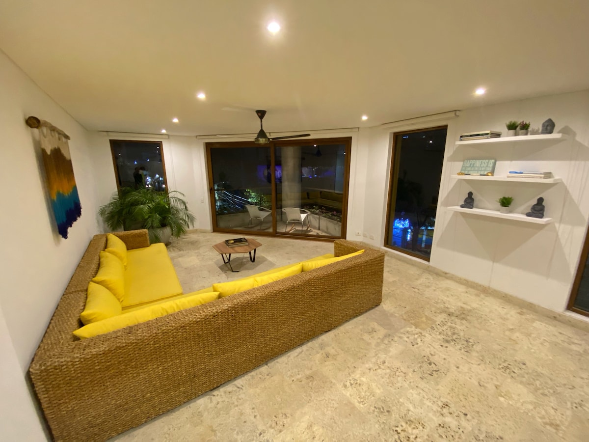 Farðu upp á þakið þar sem þú getur slakað á í tveimur sundlaugum! Íbúðin er í göngufæri (um 5 mínútur) við flóasvæðið, ströndina og bestu matargerðina og menninguna sem borgin hefur upp á að bjóða. Endilega kíktu á okkur til að fá ráðleggingar! Miðlæg staðsetning íbúðarinnar er fullkomin til að heimsækja staðbundnar strendur sem og frægustu staði í nágrenninu: Tayrona Park, Palomino, Minca og Lost City (til að nefna nokkrar!).