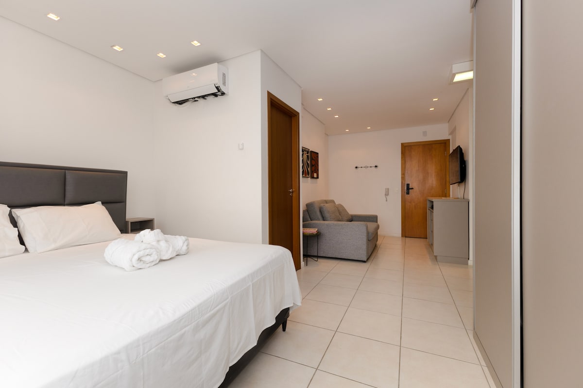 Lúxusris, 45 m2, loftræsting, borð fyrir 4 og borðplata, fullbúið og fullbúið eldhús, þvottavél, þvottavél. Nespressóvél og annað hagnýti. Mjög rúmgott með queen-rúmi, 1 svefnsófa og snjallsjónvarpi með 55'' c þráðlausu neti og neti. Fallegt útsýni! Sameiginlegt útisvæði: Full líkamsræktarstöð, þvottahús, upphituð sundlaug, nuddpottur og gufubað. Forréttinda staðsetning nálægt Diamond, Hosp. Materdei, BH Central Market, Supernossus osfrv. 1 laus staða og 24-tíma einkaþjónn Þægindi sem þú finnur heima!