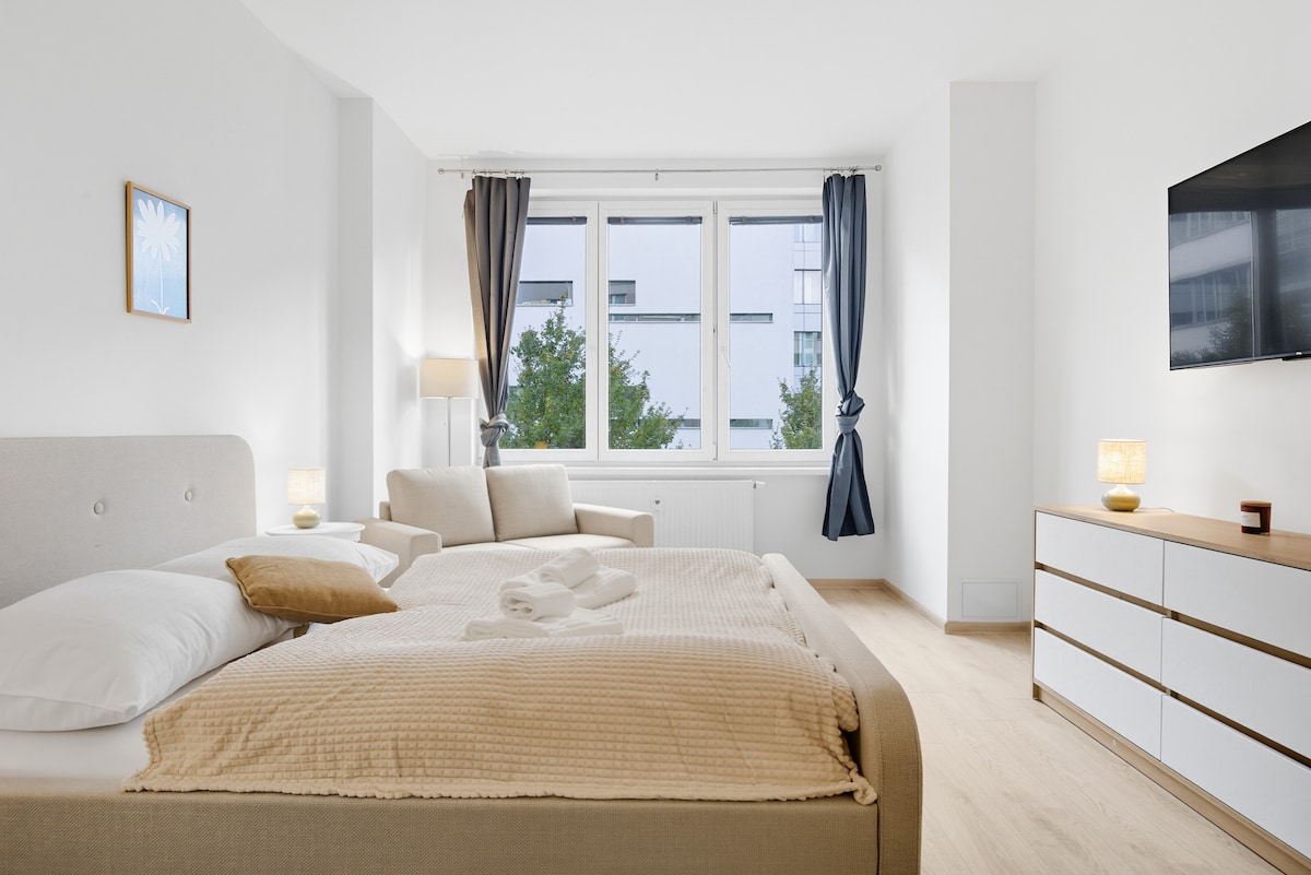 ☆ Útsýni yfir Karlsbrúarturninn ☆ Fjarlægð frá sporvagnastöð - 2 mín. ☆ Hljóðeinangraðir gluggar ☆ Matvöruverslun og hraðbanki í húsinu ☆ Þægilegt rúm ☆ Stór herbergi með mikilli lofthæð Njóttu frábærrar upplifunar til að gista í frábærri íbúð sem tengist hinni frægu Karlsbrú. Fjórða húsið er menningararfleifð. Nýhannaða íbúðin er blanda af tímalausum glæsileika og lúxus. Íbúðin er umkringd góðum veitingastöðum og þekktum kennileitum, allt í göngufæri.