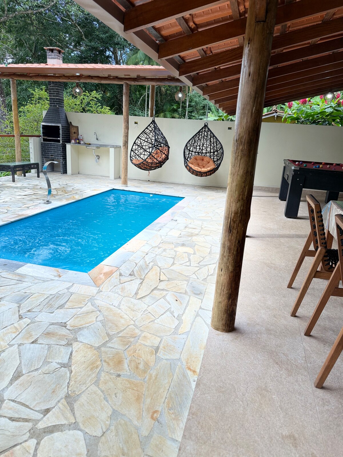 ** Við erum gæludýravæn! Hús með 3 svefnherbergjum (1 svíta), loftkælingu, 3 baðherbergjum, stórum og fallegum garði, fullbúnu eldhúsi, sundlaug, þráðlausu neti með 300 MB trefjum, grilli OG VIÐAROFNI! Rúmar 10 manns. Bílskúr fyrir 03 bíla. Húsið er glaðlegt, nútímalegt og smekklegt. Það er staðsett í rólegri götu í íbúðarúthlutun með varðhúsi og hægt er að fara inn um inngang Samola-íbúðarinnar. Húsið er við fallegu Lagoinha ströndina í Ubatuba sem er aðeins í 8 mín göngufjarlægð frá ströndinni (500 m).