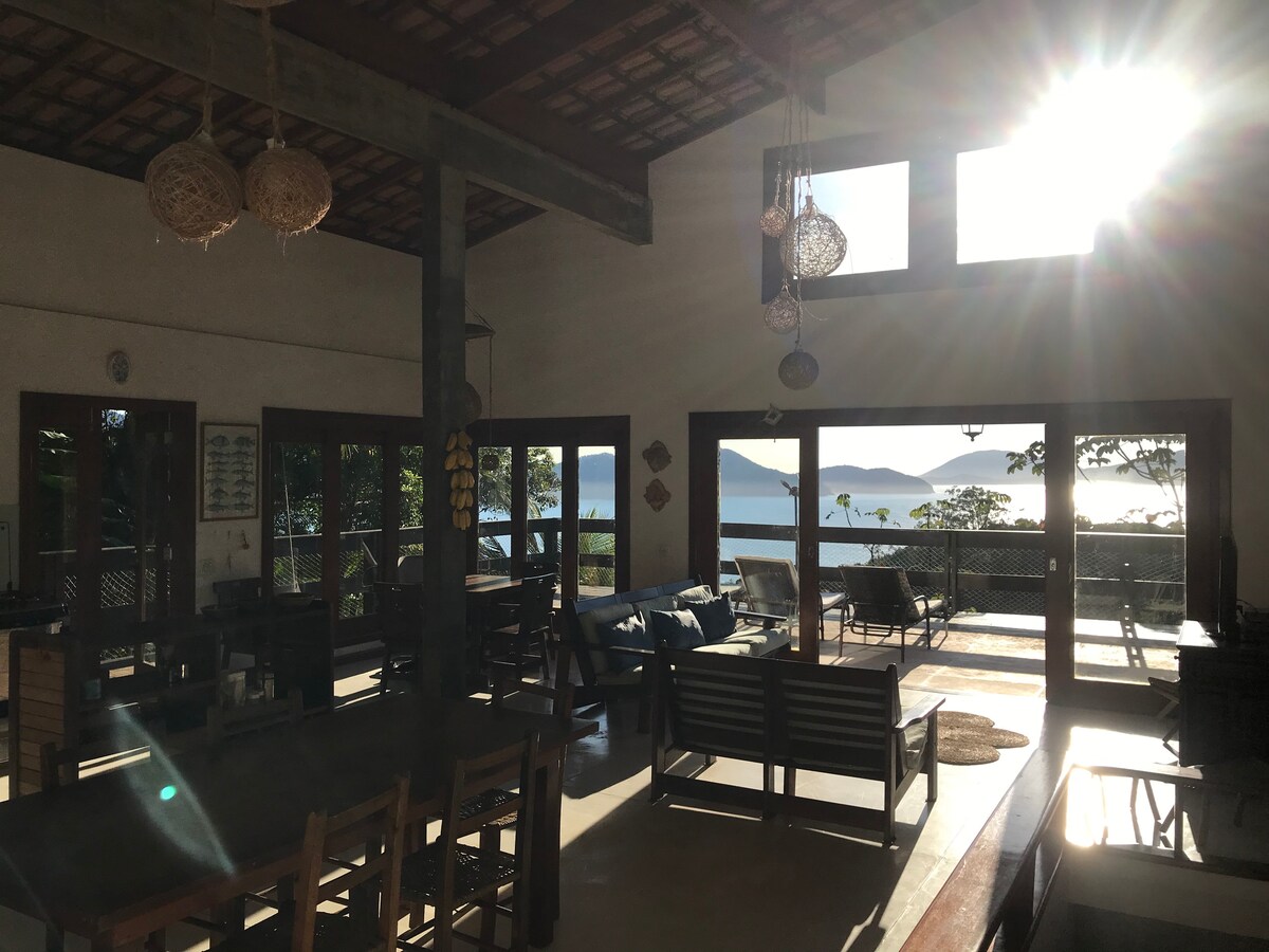 Staður með ótrúlegasta útsýni yfir sjóinn, útsýni yfir Flamengo-flóa, Anchieta-eyju, Santa Rita-strönd, Lamberto, Ribeira og fleiri... Með einkaslóð í Atlantshafsskóginum, tveimur ótrúlegum útsýnisstöðum, litlum fossum með kristaltæru vatni! Með öryggi og næði er húsið með Grikklandsþema þægilegt og uppbyggt 300m2, rúmgott og ferskt og með nýrri loftræstingu í öllum svefnherbergjum. Næsta strönd er Lamberto Beach, þú þarft að ganga 400 metra en við mælum með því að þú farir á bíl!