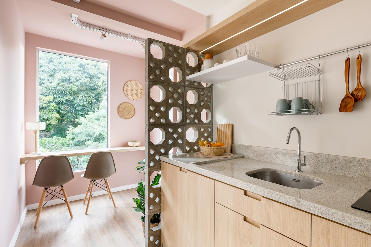 Vel loftræst og þægileg stúdíóíbúð, kyrrð, tilvalin fyrir vinnu að heiman, HITU/köldu loftkæling, göngu- og miðsvæðis í Floripa, á leiðinni að bestu ströndunum. Skrifborð og stóll, eldhús, baðherbergi. Það eru önnur sameiginleg rými fyrir jógatíma (Casa Aflorar rými), frábært útsýni yfir Beiramar og svæðið, umkringt gróskumiklum gróðri og görðum. Trefjanet, loftsteikjari, myrkvunargluggatjöld. Líkamsbygging í nágrenninu, hjólastígar.