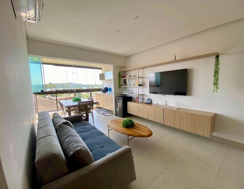 The apartment is in Eco Resort Praia dos Carneiros, right on the beachfront, next to the famous little church. It has 2 bedrooms and 65m² of space. It features a suite with a queen-size bed and a convertible suite with a standard double bed and an extra bed. The living room has a sofa bed. It has a balcony with a glass curtain. The apartment is located in the Colina sector, Tower 5, which, as the highest point in the Eco Resort, offers the best views of the beach, river, and coconut groves.