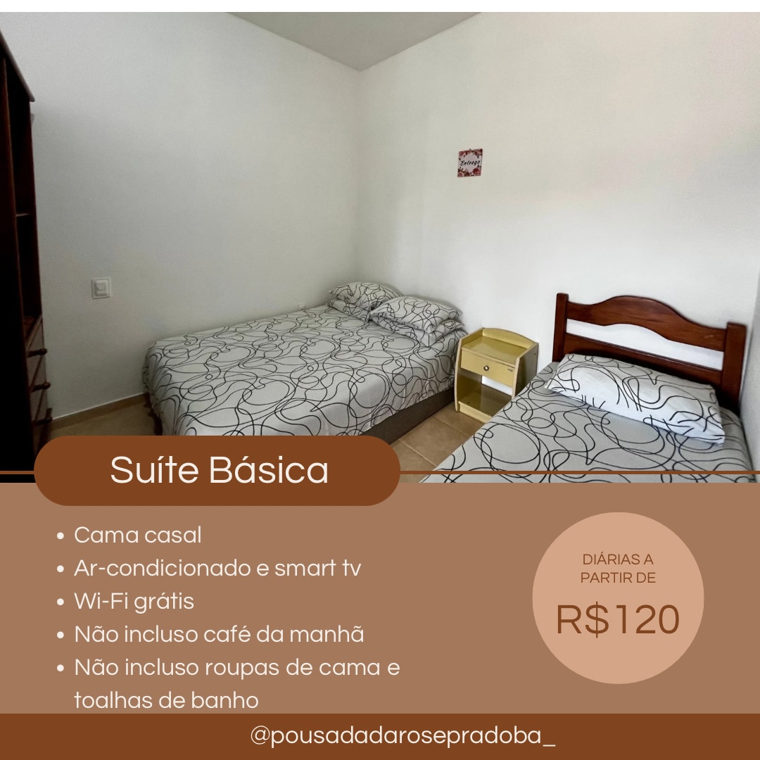 A suíte possui cama de casal, com até duas camas auxiliares de solteiro; banheiro privativo, guarda-roupas planejado, tv 32", ar condicionado split, frigobar, secador de cabelos. . Atenção! Roupas de cama e banho não estão inclusos nesse valor da hospedagem! Nem itens de higiene pessoal, nem café da manhã, nem chá da tarde, nem limpeza de quarto diária . Também não alugamos a rouparia. . Contate a Pousada Rarogui’s