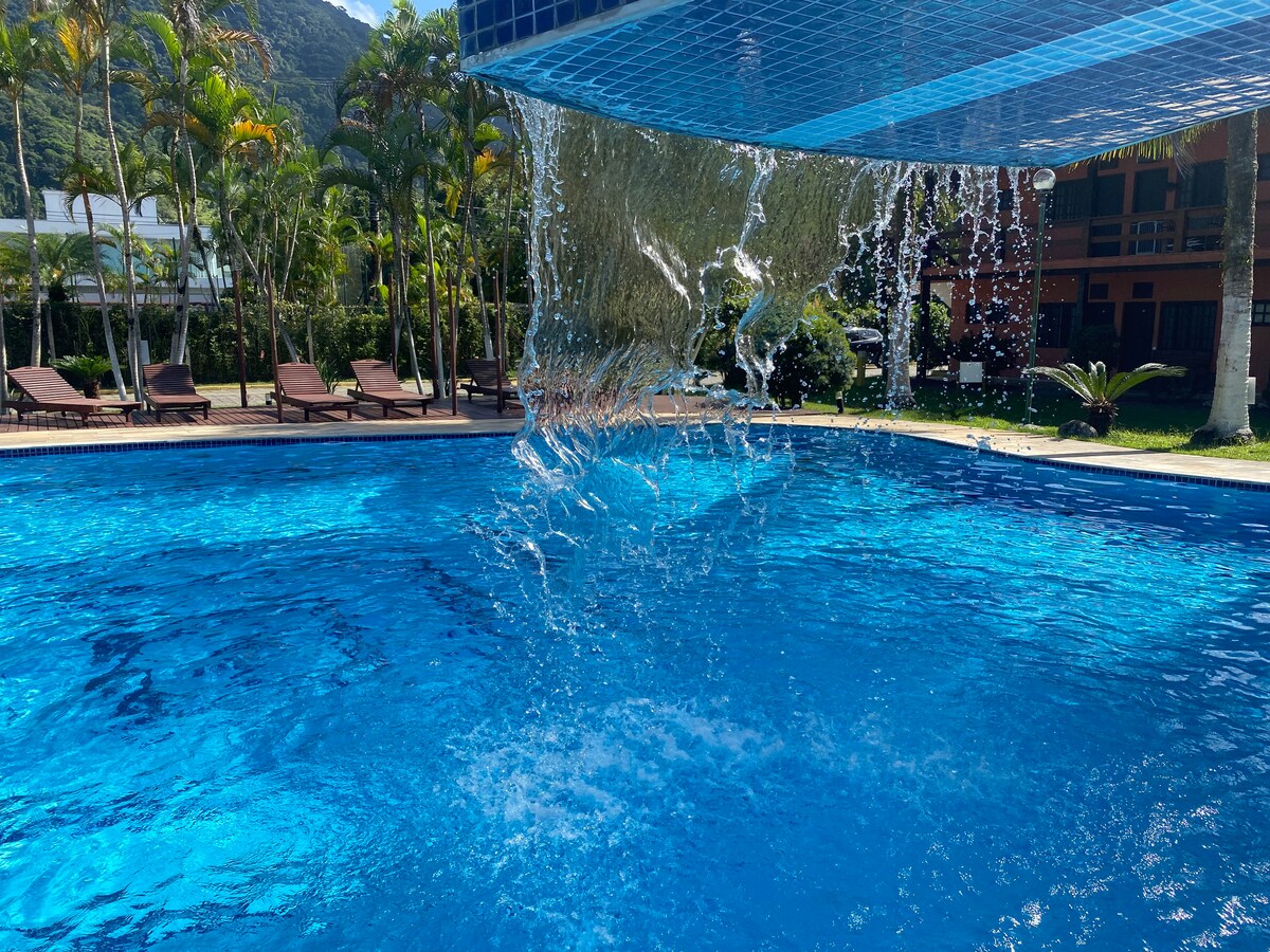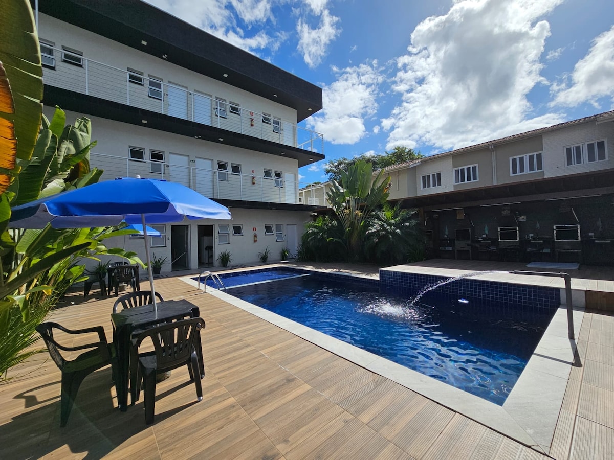 Flat á Perequê ströndinni, með forréttinda staðsetningu, í viðskiptalegum hjarta Ilhabela, með þægindum í umhverfinu. Íbúðin samanstendur af sambyggðri stofu með hjónarúmi og litlu eldhúsi. Ilhaflat er með veitingastað með nokkrum matarkostum ( ekki innifalinn í daglegu verði). Á tómstundasvæðinu eru sundlaugar ( fullorðnir og börn), tennisvöllur, líkamsrækt, gufubað og leikjaherbergi. Perequê ströndin er fyrir framan hótelið sem þarf aðeins að fara yfir götuna