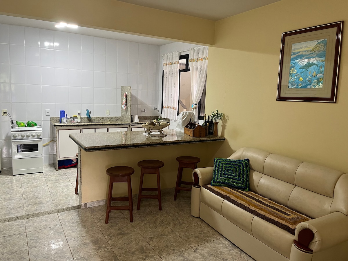 Tveggja herbergja íbúð (01 svíta) sem snýr að fallegu Peracanga-ströndinni, með nútímalegum og notalegum innréttingum. Vel staðsett bygging, svalir með sjávarútsýni í opinni hugmynd með borðstofu og stofu, nálægt öllu sem þú þarft. Þrjár paradísarstrendur (Guaibura, Peracanga og Bacutia) eru svo nálægt að þú þarft ekki einu sinni að fjarlægja bílinn úr bílskúrnum: forréttindastaður! Herbergin eru fullbúin til þæginda með þráðlausu neti í öllum herbergjum.