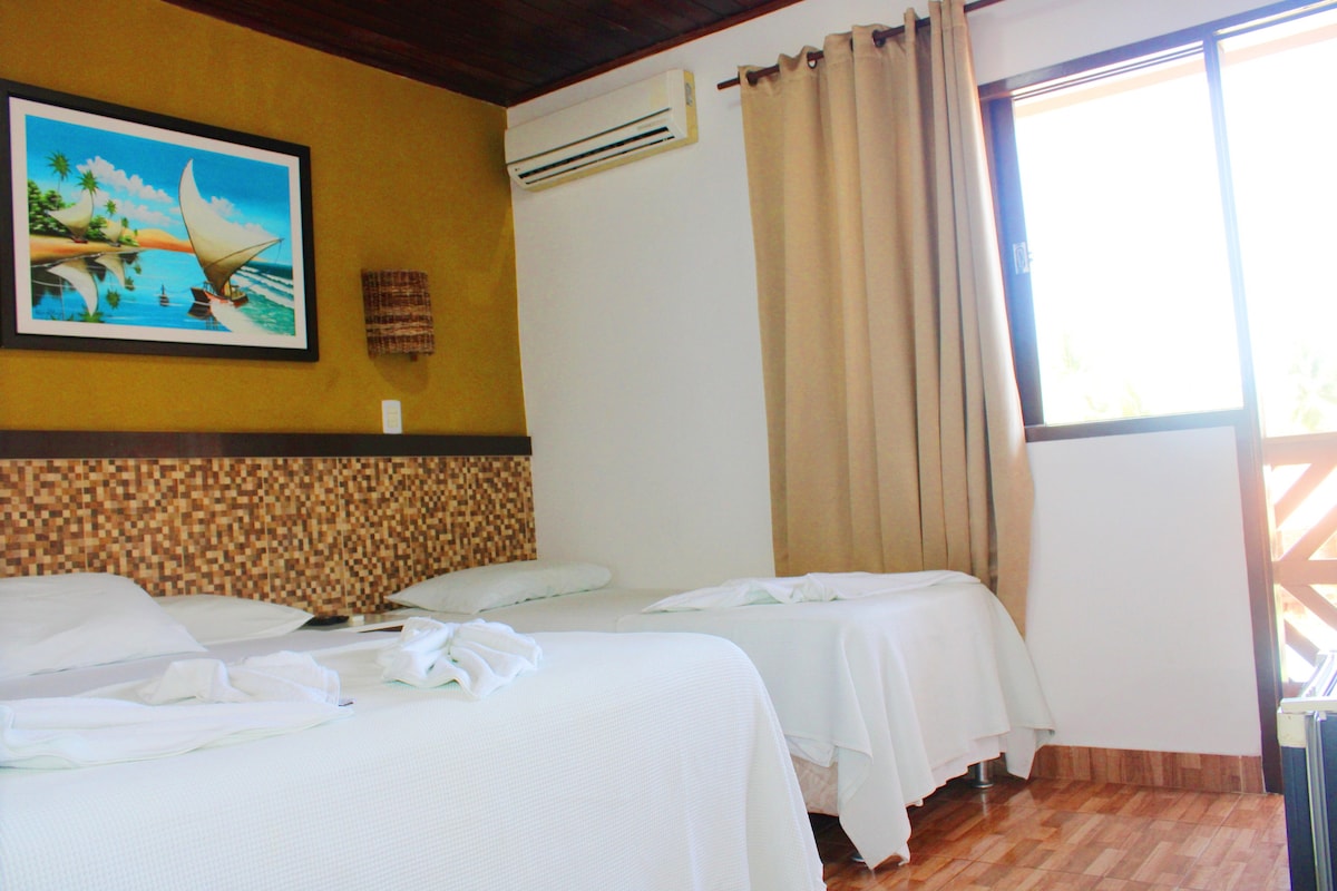 A acomodação Standard Térreo Tripla comporta até 03 hóspedes com 01 cama de casal mais 01 cama de solteiro. Equipada com ar condicionado, frigobar, smart TV, closet aberto, banheiro privativo, chuveiro elétrico, enxoval completo e varanda privativa com rede.