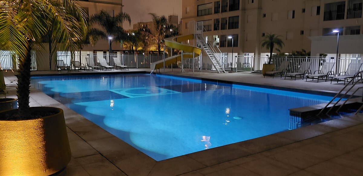 Þessi 55m² íbúð er tilvalin fyrir pör og stjórnendur í vinnuferðum. Hún hefur allt sem þú myndir búast við af íbúð: hagkvæmni og tækni. Fyrir þá sem koma til að eyða gamlárskvöldi í Santos getur þú notið hátíðarhöldanna án þess að yfirgefa bygginguna. Frá sundlaugarsvæðinu er hægt að njóta útsýnisins yfir hafið, flugeldasýningarinnar og hátíðlegrar stemningar borgarinnar án þess að þurfa að glíma við umferð, mannfjölda eða þreytandi ferðalag eftir flugeldasýninguna.