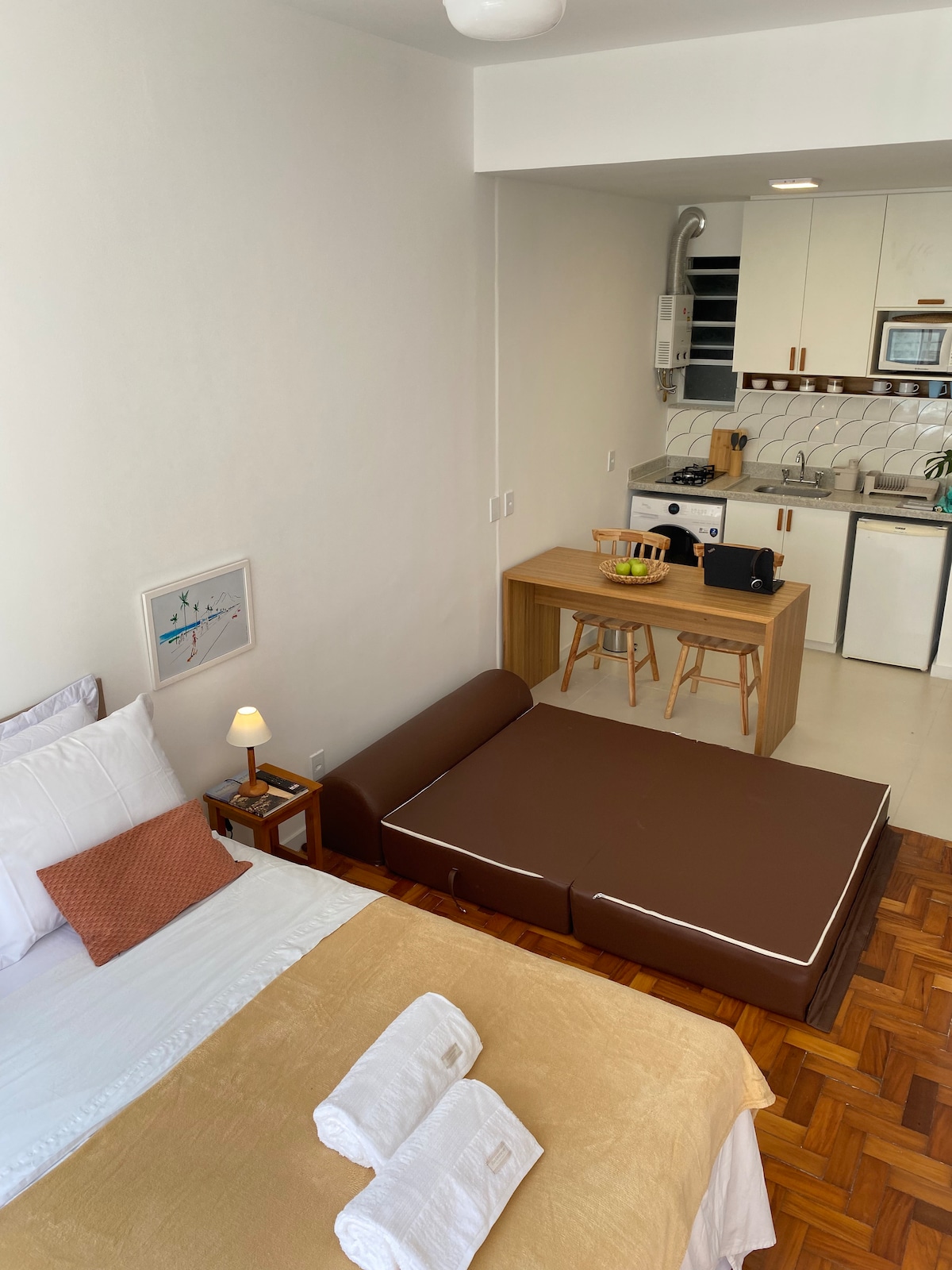 Í heillandi horni Copacabana, við Praia do Leme, aðgreinda íbúð, með svölum, hárri hæð í fjölskyldubyggingu ( 4 íbúðir á hverri hæð), einni húsaröð frá ströndinni með sjávarútsýni. Nálægt fjölbreyttum verslunum, veitingastöðum, apóteki og almenningssamgöngum. Með, stofu/herbergi í mono umhverfi, svalir um allt, fullbúið amerískt eldhús, baðherbergi með sturtu.