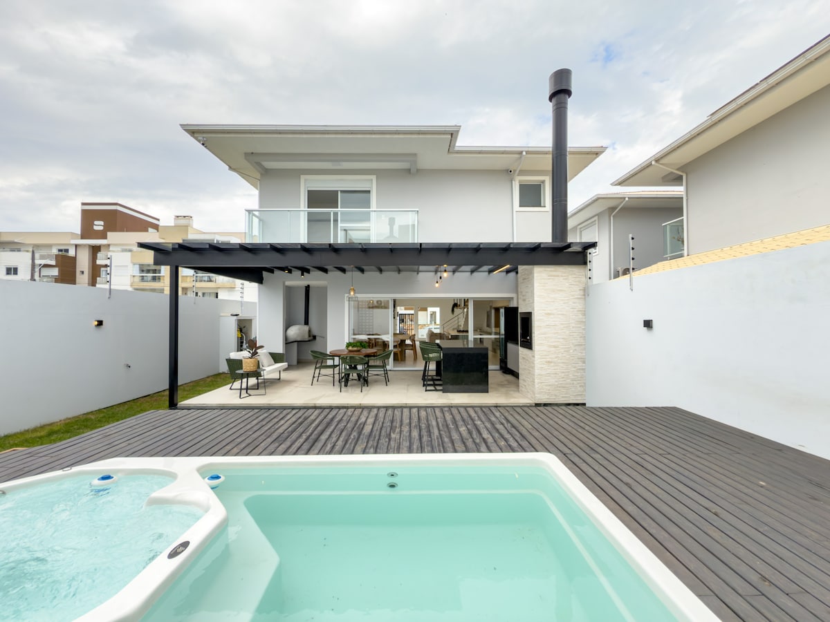 Ofur rúmgóð, hönnuð fyrir fjölskyldur sem vilja njóta sumarsins í ró á einni vinsælustu ströndum Floripa. Hér er góð stemning tryggð. Þrjár óaðfinnanlegar svítur eru til staðar þar sem hvert par nýtur eigin baðherbergis í fullkomnu notalegu næði. Útisvæðið er fullkomið fyrir daginn: sundlaug með nuddpotti, grill, pizzuofn og jafnvel arineldsstaður fyrir notalegustu kvöldin.