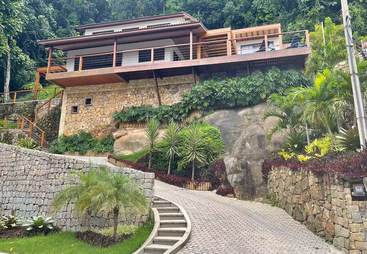 FALLEGT STEINHÚS fyrir 9 manns, í Mangaratiba, í gated samfélagi (íbúð. Guity). Einkafoss með yfirbyggðri grillhúsi við hliðina og pláss fyrir útilegueld. Fullt útsýni yfir hafið og í 50 metra fjarlægð frá strönd með rólegu vatni, eingöngu fyrir íbúðarbyggingu, tilvalið fyrir börn og aldraða og fyrir íþróttir eins og sund, róðrarbretti og kajak*. Húsið er með 3 loftkældum svefnherbergjum, 3 baðherbergjum, stórri stofu og svölum. Ofurhratt net: 500MG *leiga í boði