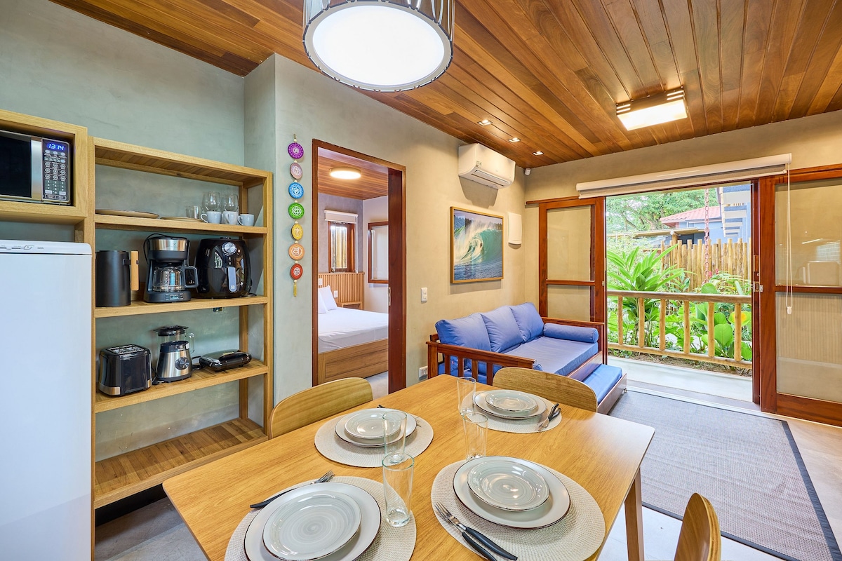 ATHUGIÐ SPA (nuddpottar, gufubað, upphituð innisundlaug) LOKUÐ vegna viðhalds Heil íbúð í Cond. Reserva DNA Svalir með bakgarði og einkagrilli. Svíta og rúmgóð stofa með salerni og loftkælingu Rúm-/baðlín fylgir, fullbúið eldhús með áhöldum, tækjum og vatnssíu. Þvottavél og þurrkari Snjallsjónvarp og þráðlaust net. Íbúðin sjálf er með ekkert sjávarútsýni, útsýnið er frá sameigninni og allir hafa aðgang.(sjá myndir) Menntuð og lítil gæludýr eru velkomin