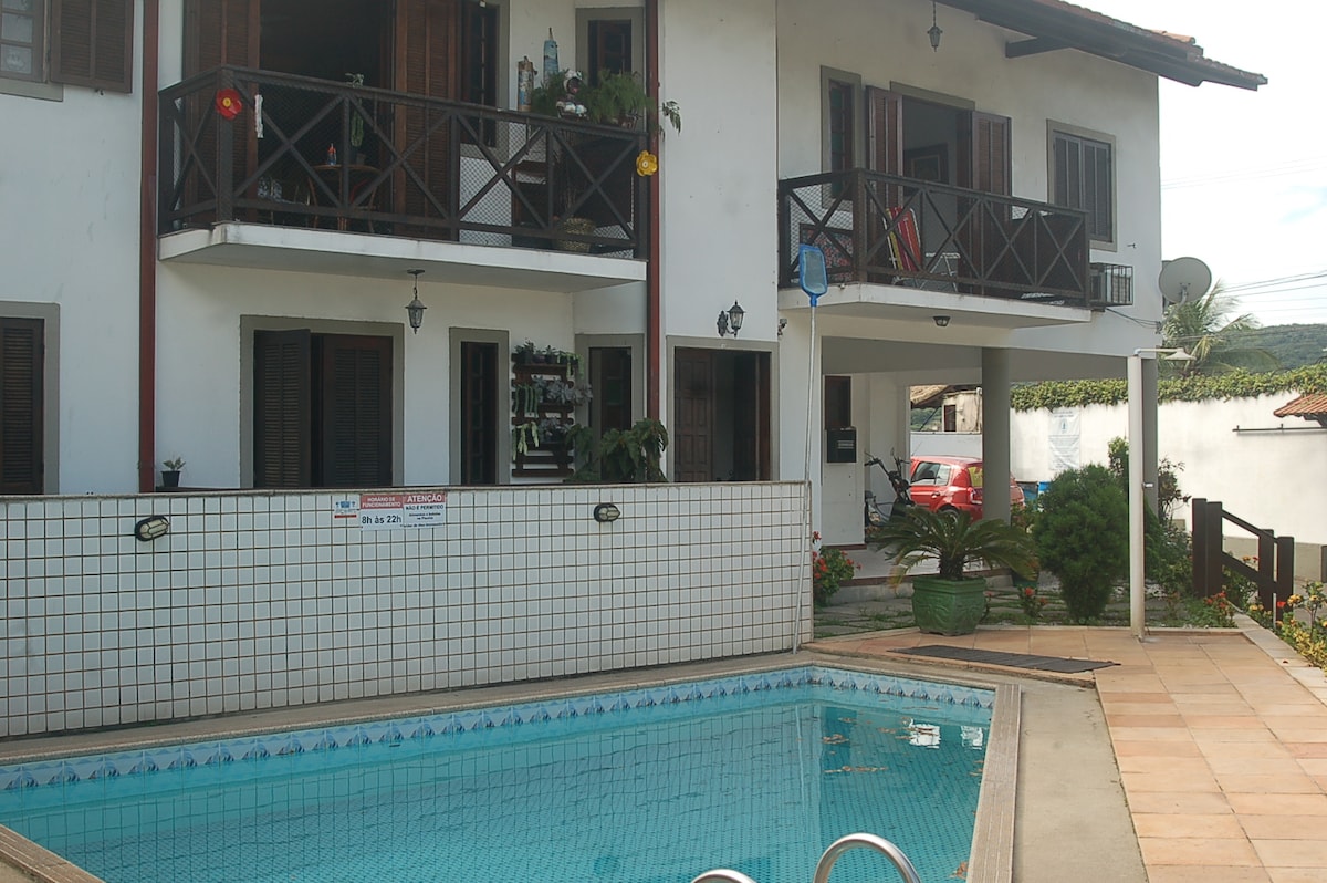 Þetta gistirými er í 10 mínútna göngufjarlægð frá ströndinni (Forte) í Cabo Frio, útisundlaug (sameiginleg). Það er í 150 metra fjarlægð frá bryggjunni til að komast að japönsku eyjunni með sjóskipi (taxiboat). 100 metra frá „Gastronomic Polo“ hverfinu í Passage. * Gistingin er ekki með kolsýringsskynjara vegna þess að öll tæki eru rafknúin. Sturta / eldavél. Það er heldur enginn bílskúr, arinn eða viðareldavél.