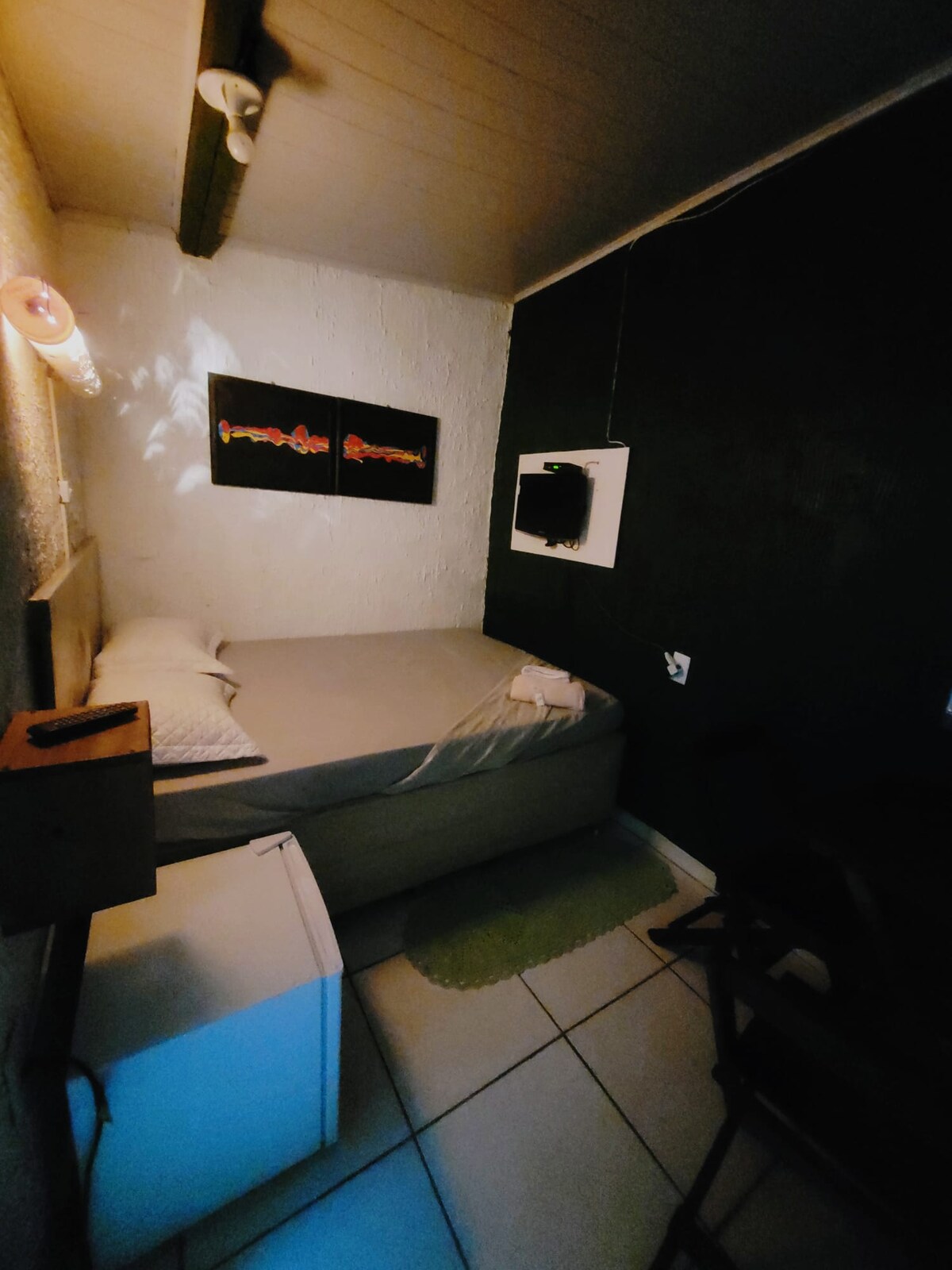 Quarto casal: Cama casal, banheiro privativo, TV, ventilador de parede, frigobar.