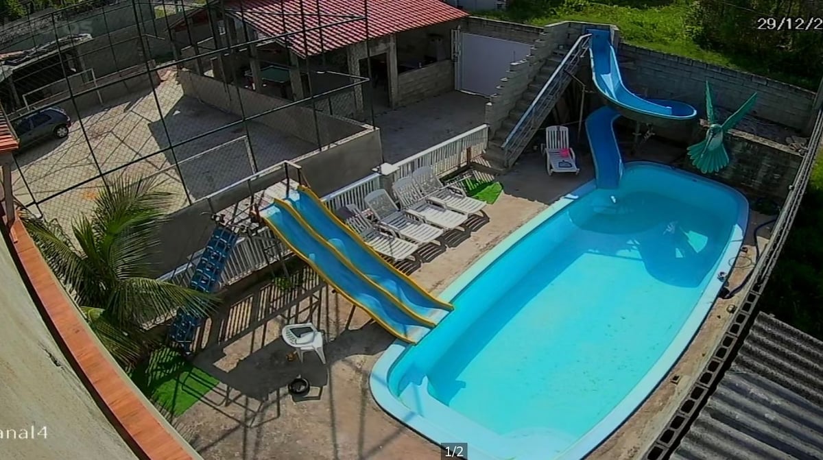 Í þessu ganghúsi eru tvær svítur með kojum, loftviftu, fullbúnu eldhúsi, stofu, sundlaug, grillaðstöðu og leikjaherbergi. Rúmgóður, yfirbyggður bílskúr. Við eigendur búum í aðalhúsinu. Gestir hafa algjört frelsi og næði í byggingunni. Við erum nálægt sjónum, um það bil 10 mín frá aðalströnd Itanhaém/SP. Rólegt hverfi heimamanna með fyrirtækjum í nágrenninu. Mjög öruggt, sjálfvirkt hlið, með stjórn, lokaður veggur.