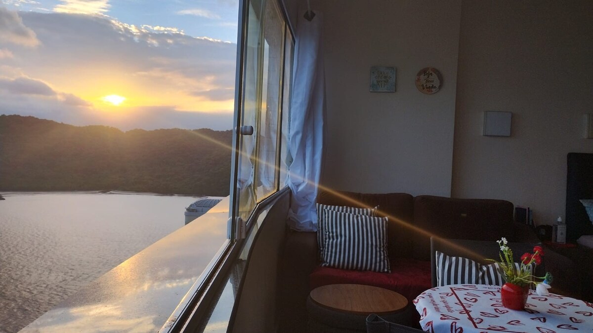 Fallegt stúdíó með stórkostlegu sjávarútsýni,bátum (skip, hraðbátar, seglbátar, sjóskíði, standandi), hengibrú og ótrúlegt sólsetur. Staðsett nálægt veitingastaðnum og choperia "Terrace" með frábærri matargerðarlist, útsýni til allra átta yfir neðri santista, lifandi tónlist og notalegu andrúmslofti. Í nágrenninu eru bátsferðir, Delta-hæð, verslunarmiðstöðvar , emissary, kláfur, heimsókn í Santos sædýrasafnið, sporvagnaferð, flaggtorg, hjólastígur og friður