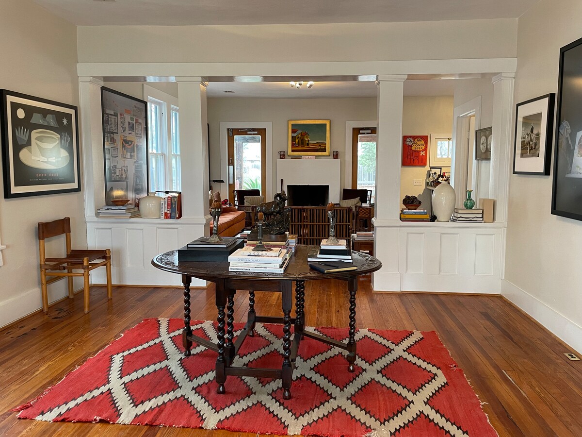 Stórt 1800sf stofurými með risastórum kofa eins og stofu með arni frá miðri síðustu öld fyrir notalega vetur í kringum eldinn. Útivist og njóttu kvöldkokkteila við sólsetur með vinum og fjölskyldu á veröndinni á bak við. Tilvalið fyrir pör og litlar fjölskyldur sem þurfa pláss og friðsæld. Það er rúmgott inn og út, rúmgott með mörgum gluggum og birtu. Þó að það sé utan alfaraleiðar í miðbænum er stutt að ganga, hjóla eða keyra að öllu því sem Marfa hefur upp á að bjóða. Fallegt landslag í allar áttir.