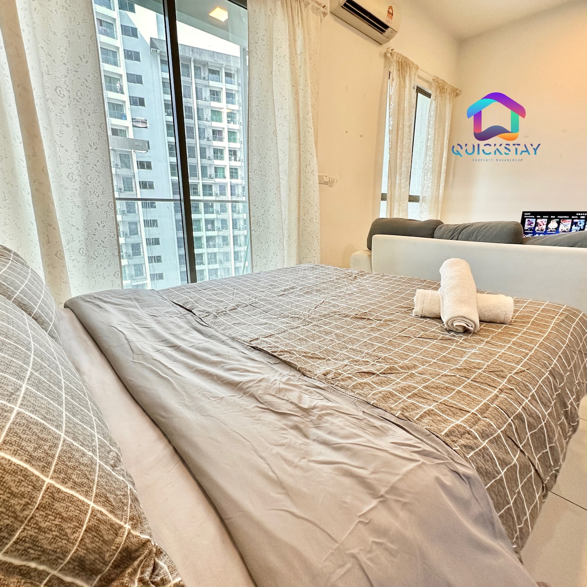 Skoðaðu notalega stúdíóið okkar sem rúmar 2 til 3 manns með queen-rúmi og svefnsófa. Staðurinn er í aðeins 15 mínútna akstursfjarlægð frá KLIA T1/T2 og er umkringdur mörgum veitingastöðum, skyndibitagreinum, matvörum og þvottahúsum, allt í göngufæri. Njóttu allra þæginda, þar á meðal leiksvæðis fyrir börn, grillsvæði, líkamsrækt og sundlaug, með öryggisgæslu allan sólarhringinn. * Ekki er hægt að sleppa farangrinum fyrir innritunartíma. Vegna þess að byggingin er hönnuð þarf að ganga 10 þrepa stiga til að fá lyftu.