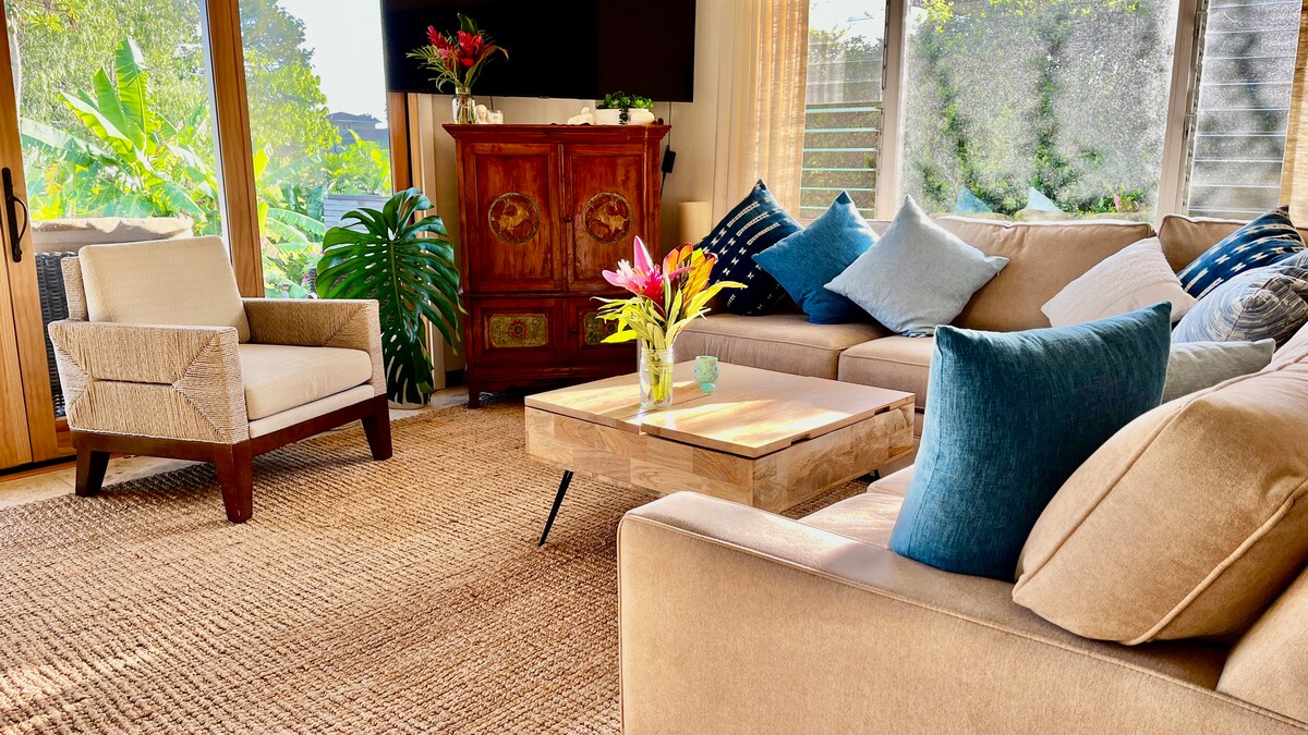 Njóttu 22 hektara Oceanview Resort okkar við rómantísku North Shore! Dvalarstaðurinn er í aðeins 10 mínútna fjarlægð frá heimsfrægum Hanalei-flóa og hitabeltisströndum og býður upp á 2 sundlaugar, fossa, heita potta, grænan stað, líkamsrækt, tennis- og súrálsboltavelli, grill, rafhjól og Tesla-leigu. Fallega íbúðin okkar er með fullbúnu eldhúsi og opnast út í gróskumikinn garð lanai. „Flottasta eignin á öllum dvalarstaðnum,“ segir ræstingafólkið. „Umsjónarteymi sem bregst best við,“ segir móttakan. Ekki leita lengra!