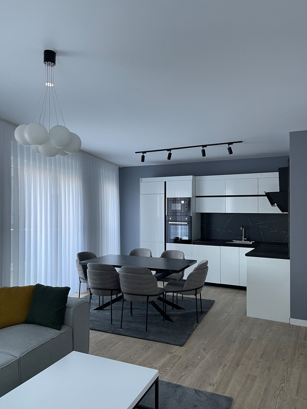 Þessi nýlokið íbúð er í nýbyggðri, nútímalegri, háhýsabyggingu í miðbæ Prishtina og innifaldur er ókeypis bílastæði innandyra. Staðsetningin er tilvalin þar sem þetta er eina byggingin í borgarblokki A1 nálægt suðvesturhringtorginu í miðhring Prishtina. Mjög nálægt nýja sendiráði Bandaríkjanna og góðar tengingar við miðborgina, þjóðvegi til allra helstu borga, hraðbraut og flugvöll.