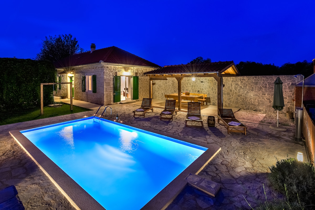Attention all nature and laid back as well as active holiday lovers!!! Beautiful new rebuilt house with heated pool, outdoor barbecue and high walls to secure your privacy, just 15 km from national park Krka. If feeling sporty challenge our counter current swimming champ for a duel... or just sit and relaxe and massage your day away... You can throw a nice pool party with your well behaved pets... just be sure if you are a smoker not to do it in the house please.
