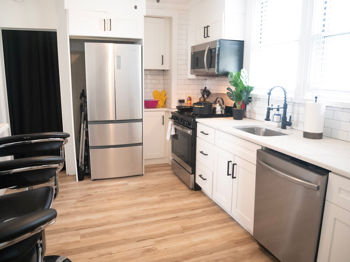 Fallegt, notalegt, sólríkt herbergi með mjög þægilegum L-laga sófa. Ofurhreint og rúmgott fullbúið borðstofueldhús með uppþvottavél, eldavél, ofni, örbylgjuofni, venjulegum og K-Cup kaffivélum, örbylgjuofni, brauðrist, pottum, pönnum, áhöldum og hnífapörum. Í íbúðinni eru (2) 43"flatskjársjónvörp; streymi HULU-Live, Amazon Prime, Disney Plus. Einnig er lítið skrifborðssvæði með ókeypis þvottavél/þurrkara og ókeypis bílastæði (skammtímaleiga í boði).